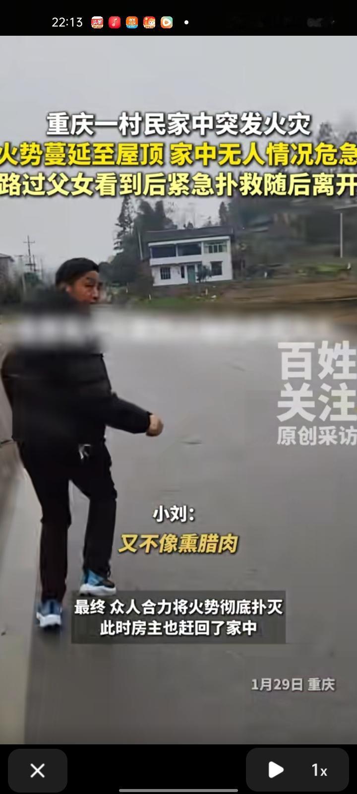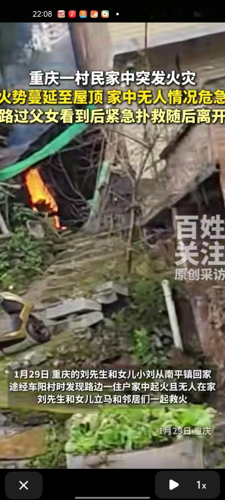 1月29日,重庆。刘先生和女儿从南平镇回家,途经车阳村时发现路边一住户家中起火且没人在家,刘先生和女儿立马和邻居们一起救火。 女儿刘女士称,当时以为是熏腊肉,想到那个火已经烧到屋顶上去了,又不像熏腊肉,爸爸就停车跑回去查看,发现确实是着火了。最后火势基本熄灭了,然后户主也回来了。 最后提醒大家,冬季用火注意安全,没人在家一定要确定没有安全隐患