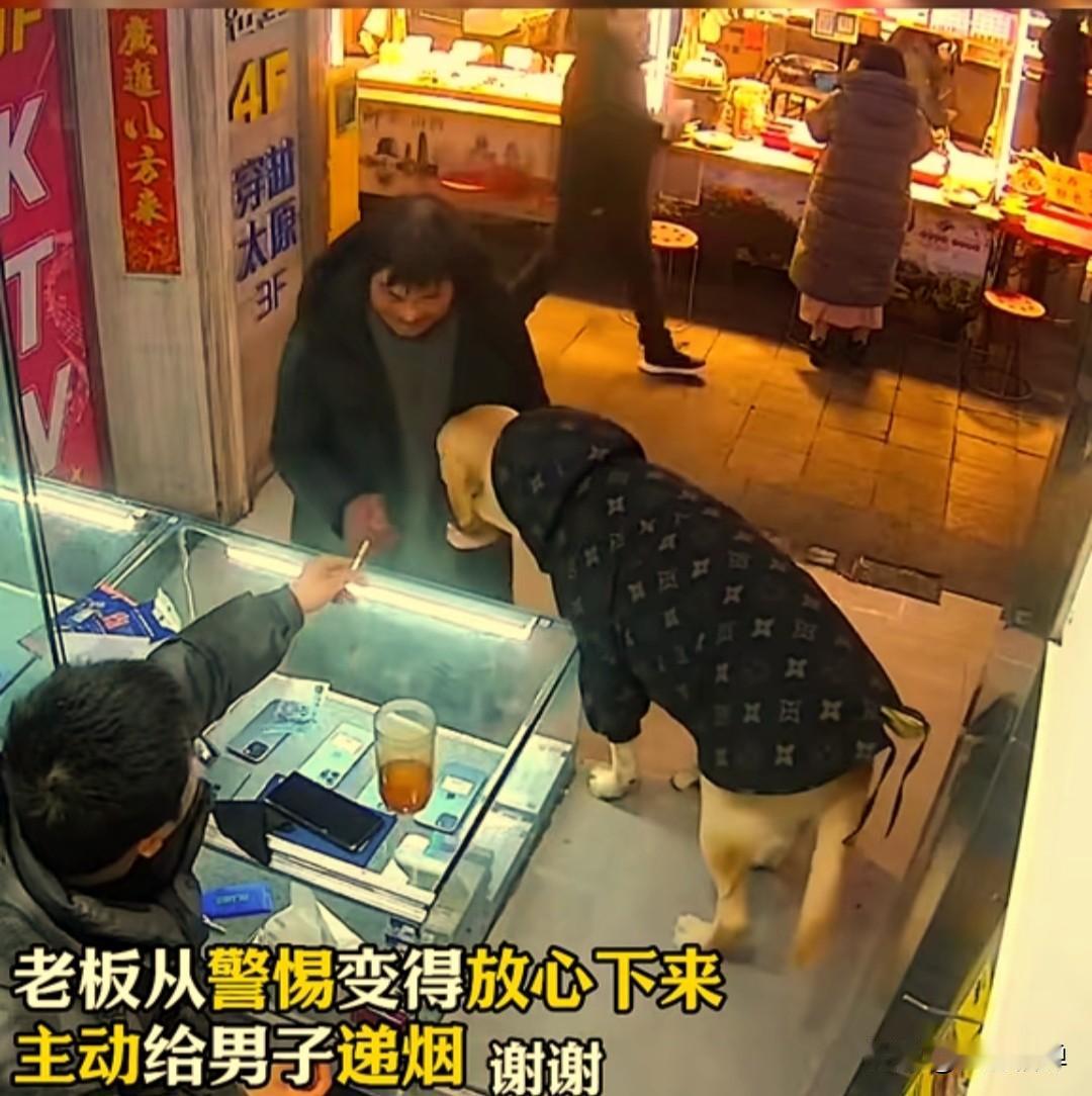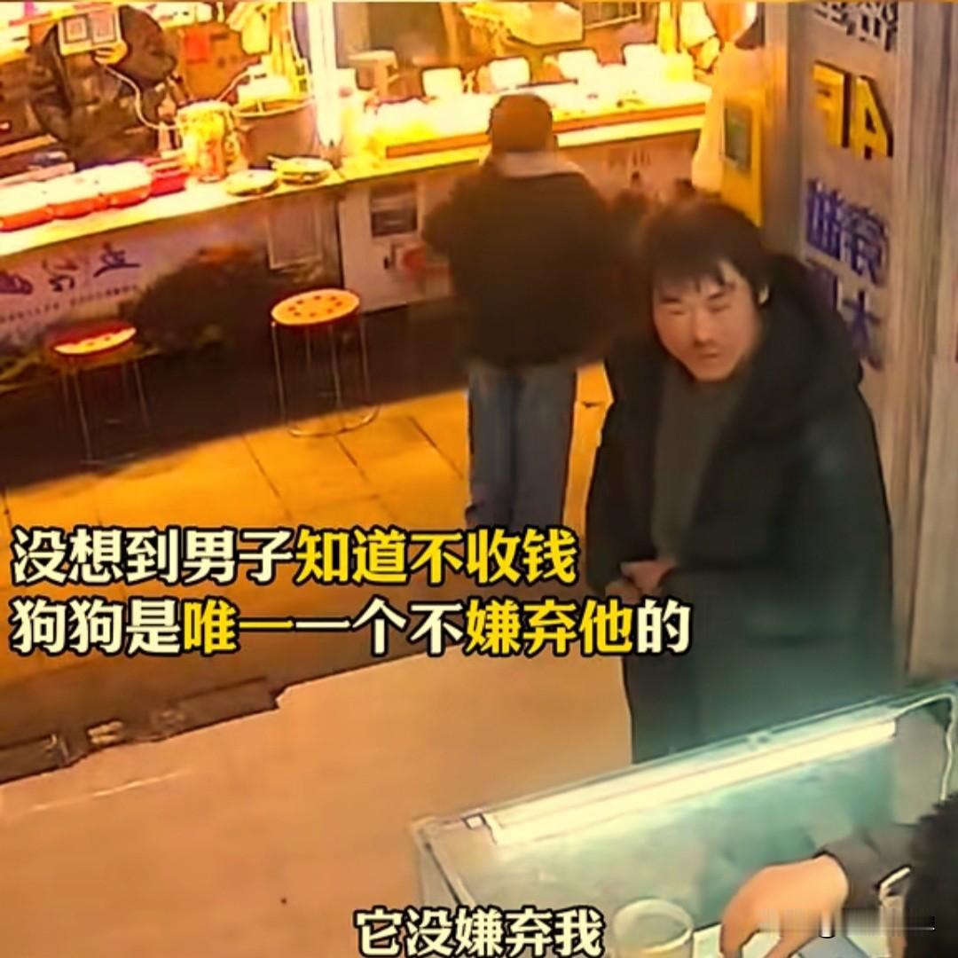 一男子到了一家手机店里面,看到一只小狗,给小狗小心翼翼的说:“我能摸摸你吗?你不要叫啊”。 这只狗狗好像听懂了他的话一样,把头伸了过去,男子摸了一会狗的脑袋,随后男子掏出了十块钱给看店的店主,说给狗的。 店主说不要不要,摸狗不收钱的。男子说:“我知道不收钱,但是它没有嫌弃我”。 老板本来看他行为有点怪异,还保持警惕,这下突然觉得心里不是滋味,掏出一根烟来递给男子,说:“来,大哥,抽根烟”。 男子双手接过,说了句谢谢,他用头轻轻和狗狗的头慢慢靠在了一起,狗狗摇着尾巴。 一句“它没有嫌弃我”,道尽多少心酸,难以想象他这是受了多少人白眼,一只狗狗温暖了他。