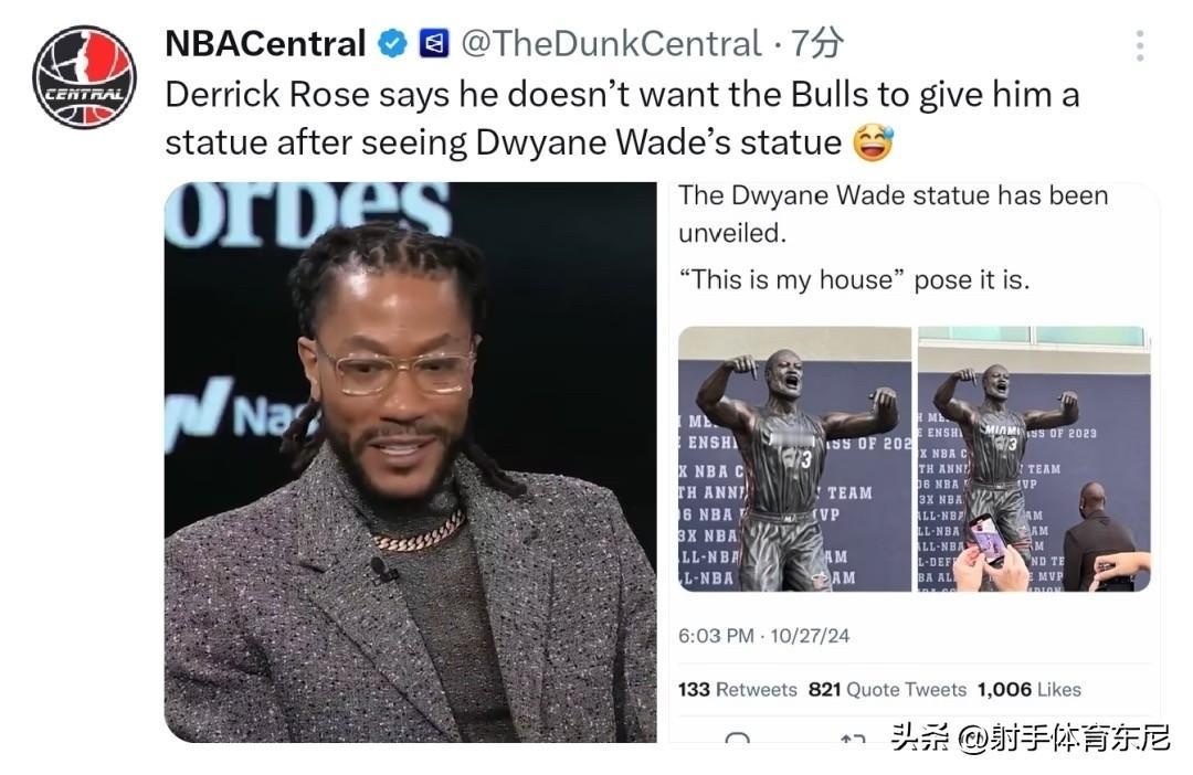 芝加哥公牛队退役了联盟历史上最年轻MVP获得者德里克-罗斯的1号球衣。 罗斯在接受采访,谈到是否期待公牛队为自己树立一座雕像时,罗斯调侃的表示道:“当我看到热火队为韦德树立的雕像(不像韦德,欠缺美感)时,我不希望公牛队为我树立雕像。”[我想静静][我想静静]