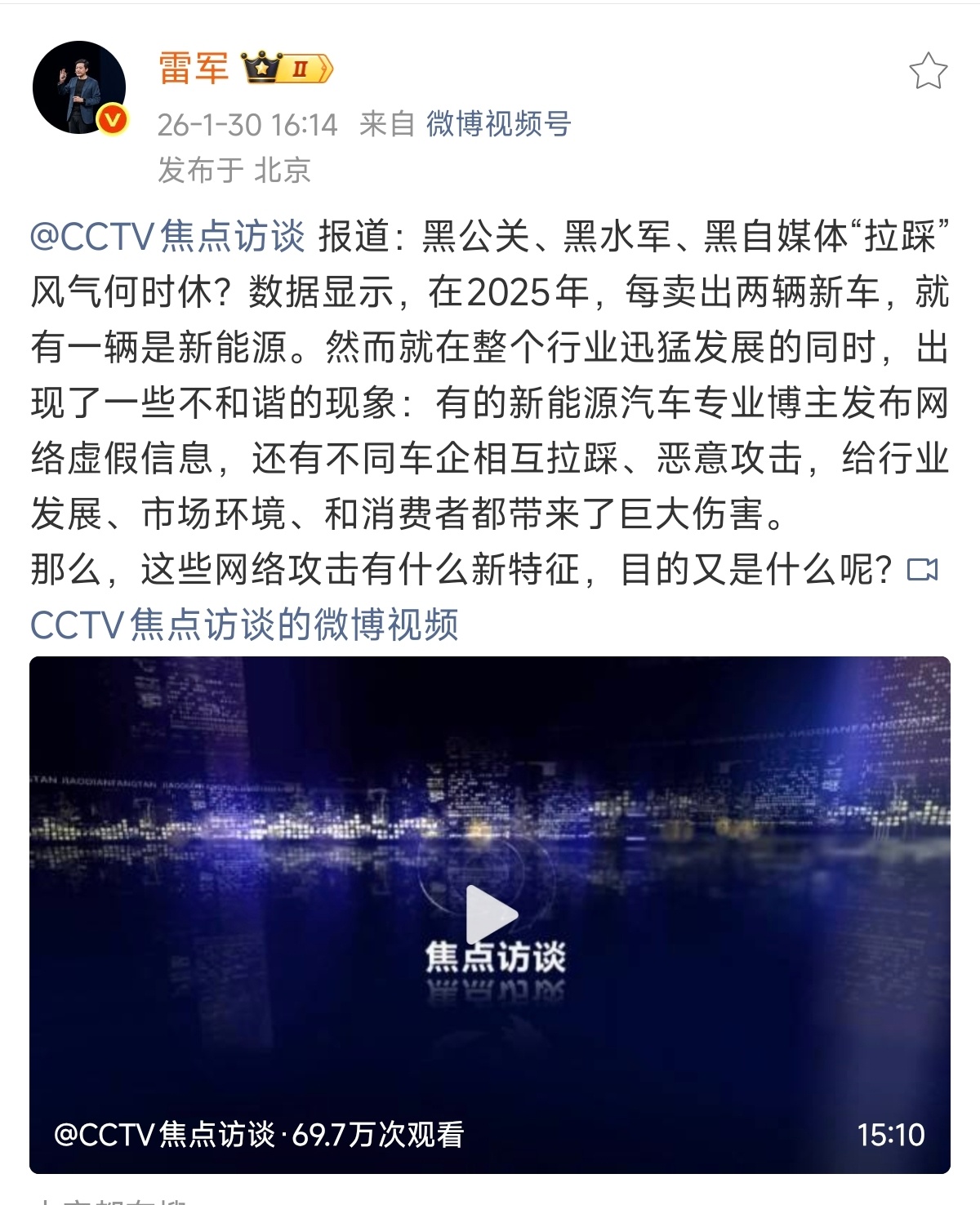 雷军一天之内两次转发焦点访谈、央视新闻针对黑水军、黑公关和网络黑产的内容。