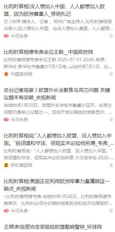 比利时首相说:“人人都想加入欧盟,没人想加入中国。美国的任何邻国都不会说想加入美国,他们都想加入欧盟,因为我们尊重他人,我们实行法治,我们说话温和。” 麻烦看官老爷们右上角点击一下“关注”,既方便您进行讨论和分享,又能给您带来不一样的参与感,感谢您的支持! 2026 年 1 月的达沃斯世界经济论坛上,比利时首相巴特・德韦弗抛出一番争议言论,称当下人人都想加入欧盟,却没人想加入中国,美国的邻国也无意愿加入美国,理由是欧盟秉持尊重他人、实行法治、说话温和的原则。这番话一出,立刻在国际舆论场引发热议,也让外界看到欧洲当下的外交心态。 德韦弗的这番表态,并非单纯的对外比较,背后藏着欧洲的现实焦虑。他坦言欧洲此前为换取美国保护,在关税、外交上不断让步,却换来美方的持续压榨,这番言论也是欧洲想要摆脱对美依赖、彰显自身软实力的一种表达。但这种简单的三方对比,显然把复杂的国际政治关系想的太简单了。 国际政治的核心从来不是单一的价值标榜,而是各国基于自身利益的多元选择,欧盟、中国、美国在国际舞台的定位和发展逻辑本就截然不同,硬放在一起比较本身就缺乏合理的前提,德韦弗的言论也因此低估了国际关系的复杂性。 欧盟作为由多个主权国家组成的联盟,从诞生起就带着内部协调的天然难题。2026 年 1 月底的欧盟外长会上,成员国在乌克兰问题的支持方式、入盟前景等关键议题上依旧分歧严重,乌克兰希望 2027 年入盟的诉求,也被德国等国直接否定。 不仅是外交议题,欧盟内部在经济合作上的分歧也十分突出。谈了 25 年的欧盟 — 南共市自贸协定,因部分成员国出于农业保护等利益考量坚决抵制,落地进程一再受阻,暴露了欧盟利益分配机制的深层问题。成员国各有盘算,让欧盟的内外政策统一变得异常困难。 德韦弗口中欧盟的 “温和”,在实际的国际博弈中,更多时候体现为决策的迟疑和行动的不果断。欧盟对外标榜的价值吸引力,说到底离不开实际的经济利益支撑,各国想要靠近欧盟,核心还是看中了欧洲的市场和经济合作机会,而非单纯的姿态表达。 反观中国,外交发展的核心始终聚焦在经济合作与共同发展上,从来没有追求他国以 “加入” 的方式开展合作,这和欧盟的联盟模式有着本质区别。中国提出的 “一带一路” 倡议,始终以基础设施建设和实打实的经济投资为抓手,为参与国家带去发展机遇。 从东南亚的港口建设到非洲的铁路铺设,“一带一路” 倡议用具体的合作项目,让各国看到了共赢的可能,这也是众多国家愿意参与其中的关键原因。中国的外交逻辑,是尊重各国主权和发展选择,通过平等合作实现共同发展,和欧盟的联盟模式、美国的霸权逻辑都不相同。 美国在全球的布局,则长期依靠军事同盟和经济制裁等手段,试图塑造符合自身利益的全球秩序。美国的邻国虽在地理上与之紧密相连,却没有加入的意愿,本质上是对这种霸权逻辑的排斥,而非单纯因为欧盟的 “温和”。 墨西哥、加拿大等国,在和美国的交往中屡屡遭遇利益挤压,这也让各国清晰地认识到,美国的对外政策始终以自身利益为核心,缺乏对他国主权和利益的尊重,这种相处模式自然难以让周边国家产生归属感。 国际关系的吸引力和竞争力,从来都不是靠口头标榜,而是靠实际的外交政策和具体行动。一个国家或国际组织能在国际上获得认可,核心是能为合作方带去实际利益,尊重各国的发展道路和主权选择,这是最基本的前提。 欧盟想要真正保持自身的国际吸引力,光靠喊出 “尊重”“温和” 的口号远远不够,更需要直面内部的深层问题。德韦弗自己也承认,欧洲目前缺乏捍卫自身主权的军事力量,还面临着美国的持续施压,想要摆脱困境,第一步就是加强内部团结。 欧盟需要优化自身的外交政策,摒弃不切实际的价值执念,在制定政策时兼顾各成员国的利益,建立更合理的利益分配机制,让决策更高效、行动更果断。同时,欧盟也需要放下身段,以平等的姿态和各国开展合作,而非将自身的价值观强加于人。 在当下的国际格局中,单边主义和霸权主义早已不得人心,各国都在追求平等的合作和共同的发展。欧盟如果能真正推动内部改革,加强多领域的国际合作,用实际行动展现自身的价值,才能真正保持住自身的吸引力。 德韦弗的这番言论,既是欧洲对自身软实力的一次标榜,也是对当下国际格局的一次误判。国际社会的相处之道,从来不是非此即彼的选择,而是求同存异的合作。欧盟、中国、美国各有不同的发展模式,唯有相互尊重、平等相待,才能在复杂的国际博弈中实现共赢。 当下的世界正处在百年未有之大变局中,旧的秩序正在瓦解,新的秩序尚未形成,各国都面临着不同的发展挑战。在这样的背景下,任何试图通过贬低他人来抬高自己的做法,都难以获得真正的认可,唯有以实际行动推动合作,才能在变局中找到自身的发展方向。