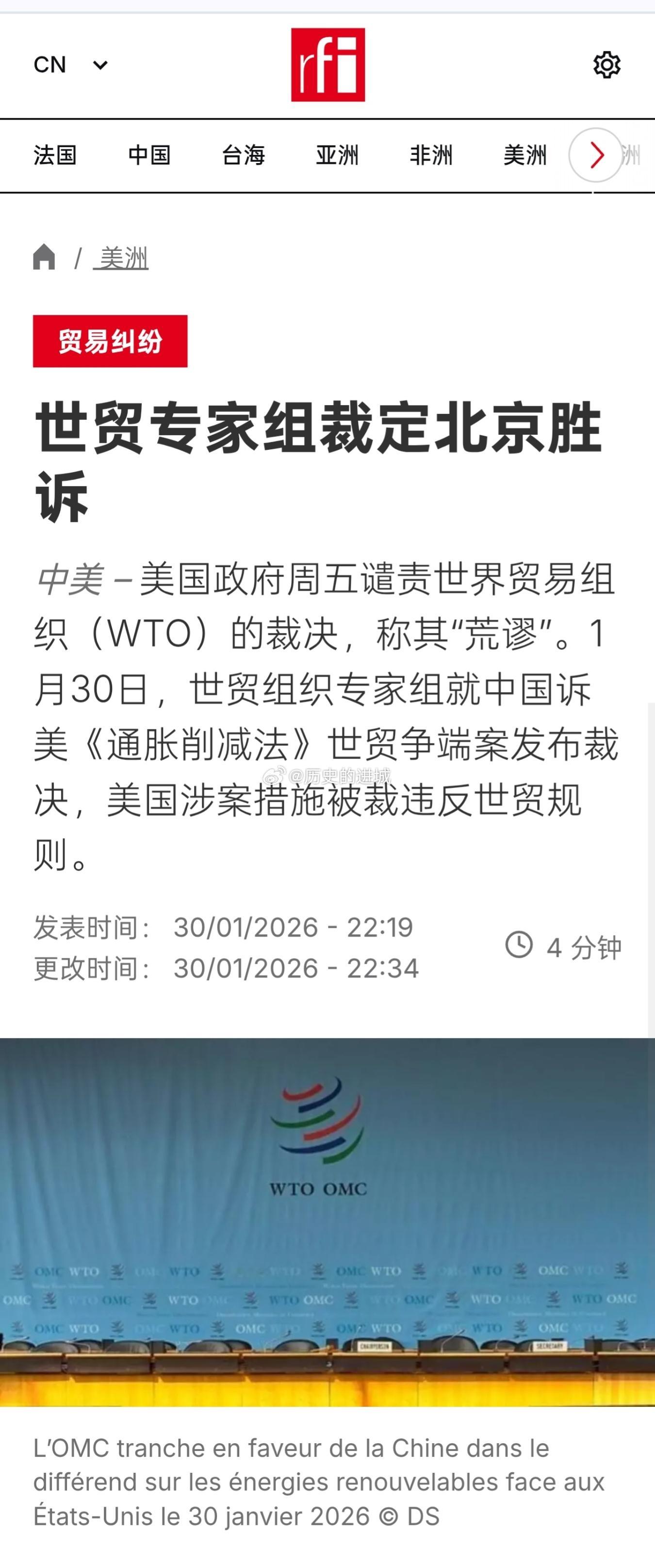 1月30日,世贸组织专家组就中国诉美《通胀削减法》世贸争端案发布裁决,美国涉案措施被裁违反世贸规则。本案专家组裁定,美涉案清洁能源补贴措施违反世贸组织规则,驳回美所谓涉案措施是为保护美“公共道德”进行的抗辩,要求美取消涉案补贴措施。海外新鲜事