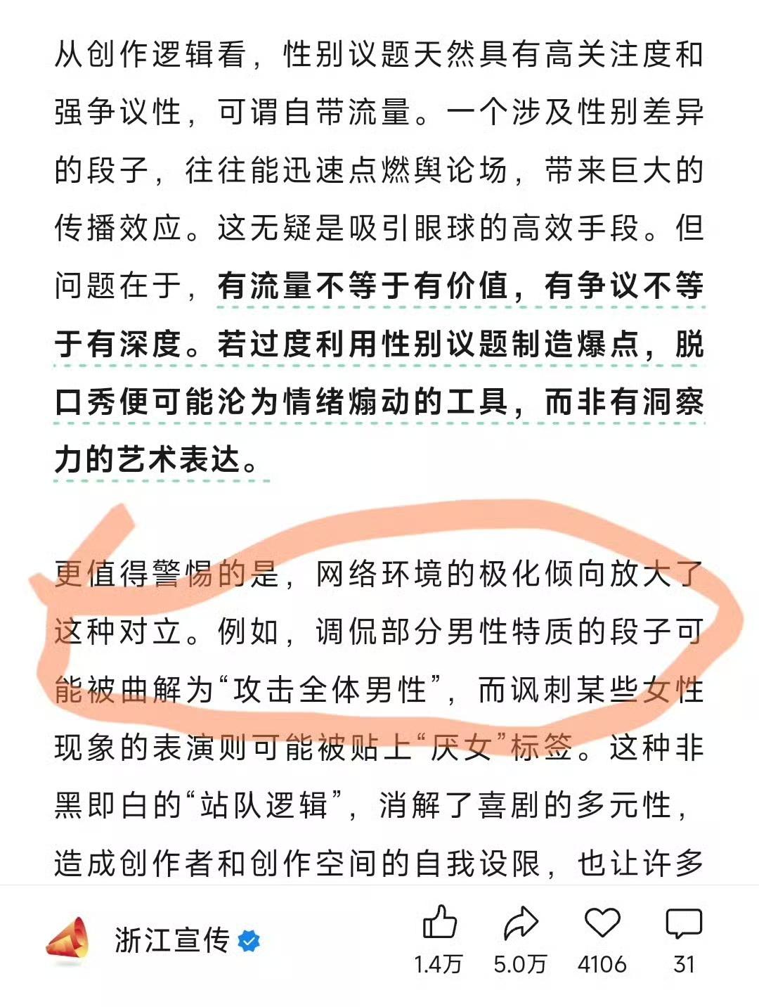 网友评价浙江宣传不点名批评不该把“三通一达”标签化,这没有错。但他却错在评判标准不应该双标化。(图一) 上次脱口秀某女演员挑起男女对立话题引起全网反对时,浙江宣传是怎么说的?请看图二,文章中是这样表达的:调侃部分男性的段子可能被曲解为攻击全体男性。 还有一句大家也可以自我体会一下:这种非黑即白的站队逻辑,消解了喜剧的多元性。 很好,既然当时浙江宣传当时就能非常理性知道是对分部人的调侃而非全部,怎么到了“三通一达”这里就突然糊涂了呢? 这个前后变化,需要浙江宣传自己进行深刻的反思。 要么按照图一的标准,调侃部分人让整个群体被贴标签。 要么按照图二的标准,调侃部分人不能被曲解为攻击全部群体。 总之不能前后标准来回切换。 大家认为呢?