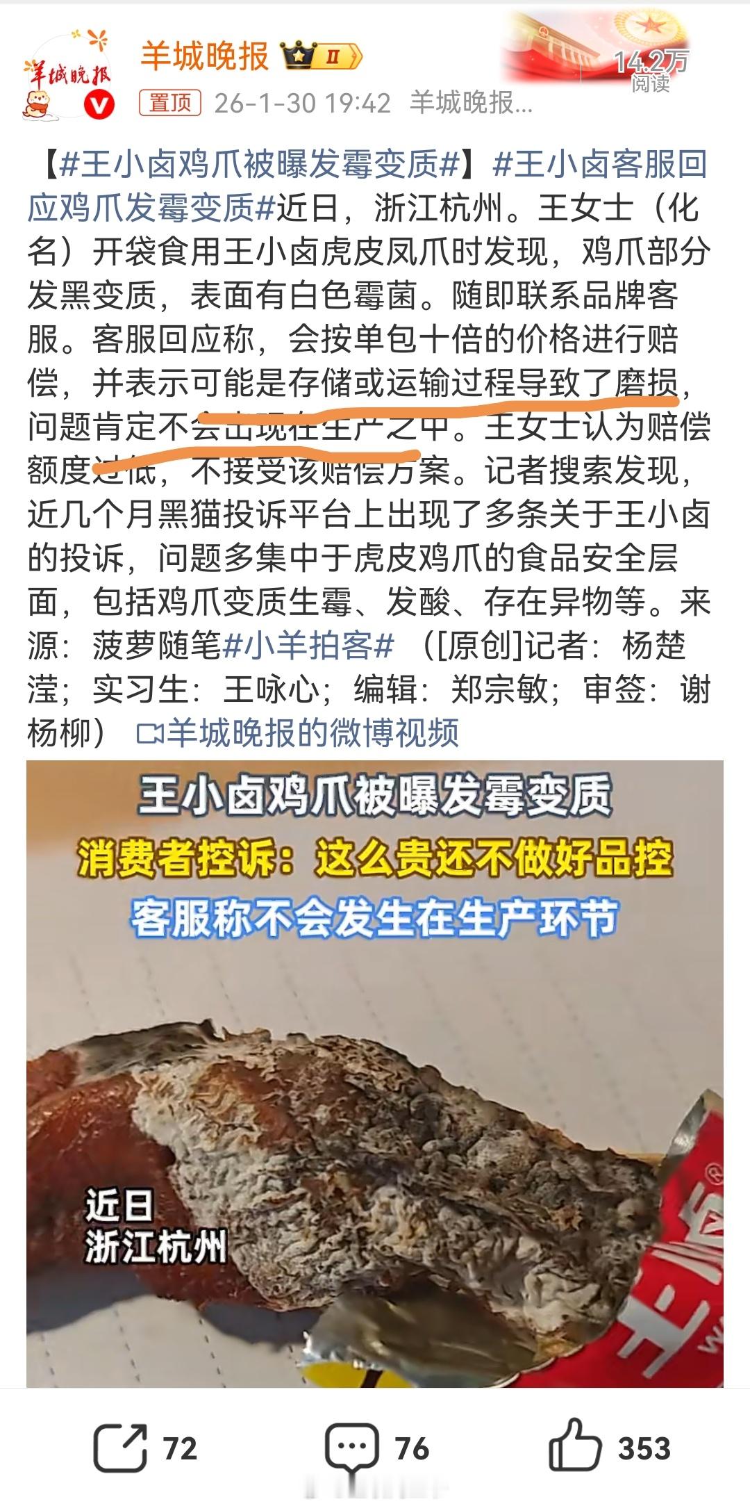 看了下整个事情经过,这次所谓的发霉质变大概率是运输中包装破损导致。王小卤虎皮凤爪是高温炸制后真空包装,生产环节本身难出现发霉情况,我家平时也买着吃过,到没遇到过这个情况。这次品牌方处理其实还蛮到位的,后续处理态度诚恳,对当事人也完成了赔付(图2,甚至超过单包十倍的价格了),没有推诿责任,这点值得肯定。但是话说回来,食品安全无小事,不管是生产端还是运输链,企业还是要把把关再收紧些!也希望所有食品品牌都能重视品控,让大家吃得放心~