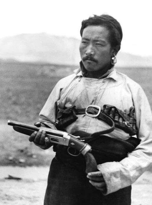 1933年,一位藏族邮递员,他站在荒凉的高原旷野中,衣料因长期奔波显得有些陈旧,腰间束着宽皮带,皮带上的金属扣泛着冷光,还挂着简易的枪套。他的左耳戴着一枚醒目的大耳环,增添了粗犷的气质。 他双手稳稳握着一把霰弹枪,枪身的木质护柄与金属部件质感分明。这并非战斗武器,而是高原邮路上的“生存工具”,邮递员需要依靠它抵御狼群、熊罴等野兽,也能威慑沿途出没的土匪,守护信件与自身安全。