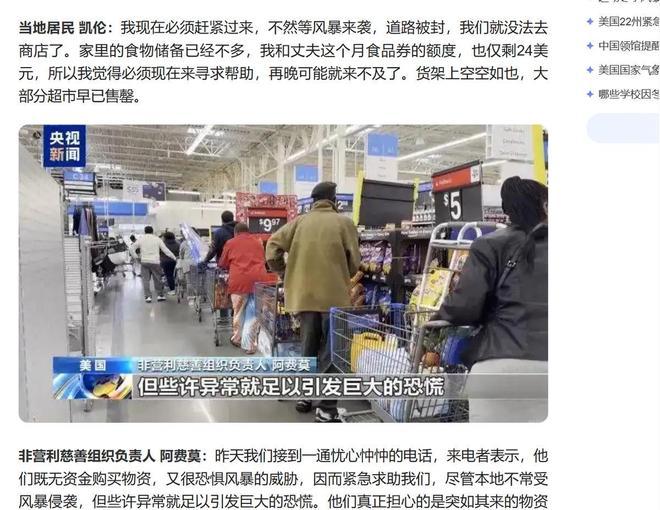 冰雪风暴如同一记重锤,从美国北部一路砸向中南部,22个州接连宣布进入紧急状态。市中心的超市,货架上已经空空如也。美国国家气象局的2026年1月报告确认:这是“几十年不遇的极端天气系统”。 这一场风暴,不仅考验着美国的应急能力,也在全球化的今天,把在美华人的安全推上了公众视野。 据《华尔街日报》报道,风暴直接影响的人口,超过全美总人口的一半。以芝加哥、明尼阿波利斯、丹佛为中心的多个城市低温破纪录,许多地区体感温度一度滑落至零下40℃。恶劣天气不仅让人冷得发抖,更让整个社会系统变得摇摇欲坠。 仅上周末,全美航班就已被取消超过1.1万架次,高速公路封闭、铁路运输缓行,甚至连城市公交都出现自动停运。配电系统原本就老化,如今面对暴雪和极寒直接断线,有些地方的居民家里断了电、暖气、水,整栋小区只能靠蜡烛照明、靠邻居支援。 美国国家气象局提供的数据显示,这场风暴刷新了多地数十年低温记录,而背后暴露出的电网韧性之差,也再次引发民众对公共基础设施的不满。 你能想象,2026年的美国居民还在排队抢柴火和手动取暖器吗?在城市与乡村之间的超市,人们蜂拥而入,冲进货架,搬起瓶装水、罐头、奶粉就是一通抢,无论有没有小孩,都先占上两箱再说。 加油站更离谱,长龙至少几十米,有人直接把油桶打包带走生怕下一小时就断供。面对这些场景,民众对应急物资迟迟送不到位的情绪日益高涨,质疑声直指联邦与州地方之间的协调机制。 美国总统特朗普在社交平台上重复强调“政府高度重视”,财政部长贝森特也紧急调拨紧急救援资金。但坊间声音却并不买账,“调是调了,可落实去哪儿了?”很多州政府抱怨资源不到位,联邦则反驳地方配合力度不足。 当美国本土眼花缭乱地应对危情时,中国驻芝加哥总领馆依旧“眼到人到”。风暴袭来前48小时,领馆在官网和多地微信群中发布了分区域安全提醒,特别提示在美中国公民储备水电暖应急物资,注意出行安全,并提供紧急联系通道。 不仅是留学生第一次感受到使领馆的“温度”,一些在美多年工作的技术移民也坦言,这种时刻里,来自祖国的一个信息,就是一种心理依靠。这不仅是紧急事件下的外交行动,更是中国对全球公民安全观的体现:人在海外,情牵祖国,任何突发状况,背后都有一套体系为你兜底。 但问题不能只停留在“谁喊话更及时”这一层。从德州雪灾到这次全国寒潮,美国在极寒天气前的脆弱早已暴露。特别是在电网这块,美式分权体制下联邦和州权的博弈,让事关生死的基础服务成了扯皮对象。 风来的时候救援靠州,风停后问责才找联邦,这种体制下公共服务的效率自然难提升。 事实上,德州在2021年雪灾后已承诺推动电网韧性改革,但五年过去,今天的风暴照样讓无数人陷入断电断暖的困局。 联合国气候组织早在去年的年报中就指出,全球“极端冷暖交错”的状态将成为常态。美国不是唯一的受害者,但却是最具代表性的例子:在拥有最强科技实力的国家,依旧挡不住大自然在冬日里的一次咆哮。 这说明,一套真正有效的灾害预警和应对体系不在于你拥有多少高精尖技术,而在于民众最需要保护时谁能出现在一线。 这一轮风暴,撕开了美国公共应急反应的“绷带”,也再次强调了基础设施能力、人文关怀与国家制度之间的联动逻辑。等暴雪融化、人们重归日常,真正的问题才刚刚开始:究竟还要多少次“天灾”才能让制度真正进化?又有多少“无声的等待”会被再次埋在雪里? 超市货架遭抢空!上万架次航班取消!美国22个州进入紧急状态,中领馆提醒——2026-01-25 13:02·红星新闻