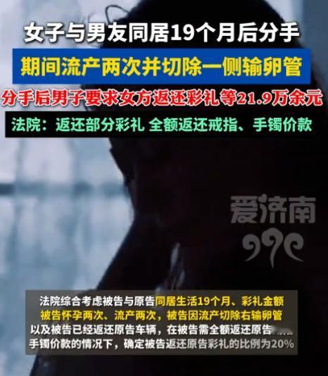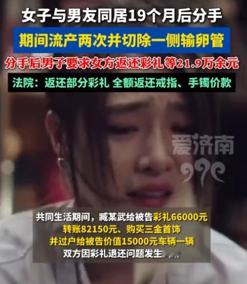 山东诸城,女子和男子相识半个月后发生关系,并开始了同居生活,期间二人还办了婚宴酒席但没有领证。可在同居的19个月中,女子因连续两次流产导致切除了一侧输卵管,男子则认为女子身体有缺陷,今后可能无法生孩子,于是提出分手,并要求女子返还全部此阿里21.9万余元,但遭到了拒绝。后男子将女子告上了法院。 故事的主人公,是诸城当地的臧先生和邵女士,两人的缘分始于2022年8月的一场介绍,没有漫长的暧昧铺垫,一切都来得格外仓促。 相识刚满半个月,一次朋友间的聚餐结束后,借着酒意与情愫,两人突破了边界发生了关系,这份仓促的亲密,也让他们加快了在一起的脚步,没过几天便收拾行李,搬到了一起开始同居。 同居后的日子,初期满是新鲜感,臧先生觉得邵女士手脚麻利、性子温和,邵女士也觉得臧先生老实可靠、愿意付出,两人都想着,不用太刻意纠结领证的形式,先办场婚宴稳住日子,也算给双方家人一个交代。 就这样,2023年5月1日,两人按照老家的规矩,办了一场风风光光的婚宴。 可只有臧先生和邵女士自己清楚,这场看似喜庆的婚宴,不过是给同居关系镀上了一层“仪式感”。 从始至终,他们都没有去民政局办理结婚登记,自始至终,都只是名义上的“情侣”,而非法律意义上的夫妻。 为了这场婚宴,也为了维系这段同居关系,臧先生确实付出了不少心思和钱财。 按照当地的婚嫁礼数,他给了邵女士66000元彩礼,图一个“六六大顺”的好寓意,还特意挑选了一套黄金首饰,涵盖了戒指、手镯等物件。 除此之外,平日里的柴米油盐、婚宴筹备的各项开支,臧先生也都主动包揽,陆续给邵女士转了82150元,甚至大方地把自己名下一辆价值15000元的代步车,过户到了邵女士名下。 2023年2月,邵女士意外查出怀孕,这个消息像一束光,照亮了两人的生活,他们悄悄盘算着孩子的名字,规划着以后的日子,满心都是对新生命的期待。 可这份期待,仅仅持续了不到两个月,就彻底破灭了,邵女士意外流产了。 突如其来的打击,让邵女士瞬间崩溃,身体变得十分虚弱,心理上也留下了阴影,臧先生虽然也很失落,但起初也一直陪在她身边照顾。 当时,医生特意反复叮嘱邵女士,术后必须安心休养,短期内绝对不能行房事,否则会严重伤害身体。 可那时的两人,都没有把这份叮嘱放在心上,一心想着尽快再要个孩子,没能严格遵守医嘱。 在邵女士休养了大半年后,她再次怀孕,这次,两人都格外谨慎,生怕再出一点意外,可命运似乎格外残忍。 怀孕三个多月时,意外再次发生,邵女士再次流产,而且这次的情况,比第一次要严重得多,出血量很大,生命垂危。 为了保住邵女士的性命,医生迫不得已,做出了切除她右侧输卵管的决定,邵女士的父亲得知女儿的遭遇后,悲痛欲绝。 既心疼女儿的身体,又气愤臧先生没有照顾好她,多次找到臧先生理论,情绪激动之下,还对臧先生动了手,要求臧先生对女儿的身体损伤进行赔偿。 也正是从这时起,臧先生对邵女士的态度,开始一点点变冷、变差。 2024年3月,臧先生经过反复思量,最终还是向邵女士提出了分手,话说得直白又冷漠:他觉得邵女士身体有了缺陷,以后可能生不了孩子,这段关系,继续下去也没有任何意义了。 比分手更让邵女士心寒的是,臧先生在提出分手的同时,还拿出了一份早已列好的索赔清单,要求邵女士全额返还他之前付出的所有财物,加起来足足有21万余元。 邵女士想都没想,就拒绝了这个不合理的要求,在她看来,自己为这段关系付出的,远比钱财更珍贵。 僵持不下之际,臧先生索性撕破了脸,一纸诉状,将邵女士告上了诸城市人民法院,要求法院判决邵女士,全额返还他付出的219400元财物。 法院受理此案后,没有偏袒任何一方,而是进行了详细的调查取证,仔细核实了双方提交的证据,结合两人同居的时长、财物的使用情况、双方的过错等多方面因素,最终做出了公正合理的判决。 法院认为,臧先生和邵女士虽然按照习俗举办了婚宴,且共同生活了19个月,但两人并未办理结婚登记手续,不符合法律规定的婚姻关系。 因此,臧先生要求返还彩礼的诉求,符合相关法律规定,应当予以支持,但并非全额返还。 最终,法院酌情判定,邵女士返还臧先生20%的彩礼,也就是66000元的20%,共计13200元,再加上无法原物退还的黄金首饰折价款17384元。。 邵女士合计需要返还臧先生30584元,同时驳回了臧先生要求全额返还财物的诉求。 判决结果出来后,双方都没有提出上诉,一致表示认可,并且达成了和解,这场持续了19个月、充满了甜蜜与遗憾、争吵与纠葛的同居关系,终于在法律的裁决下,画上了一个无奈的句号。