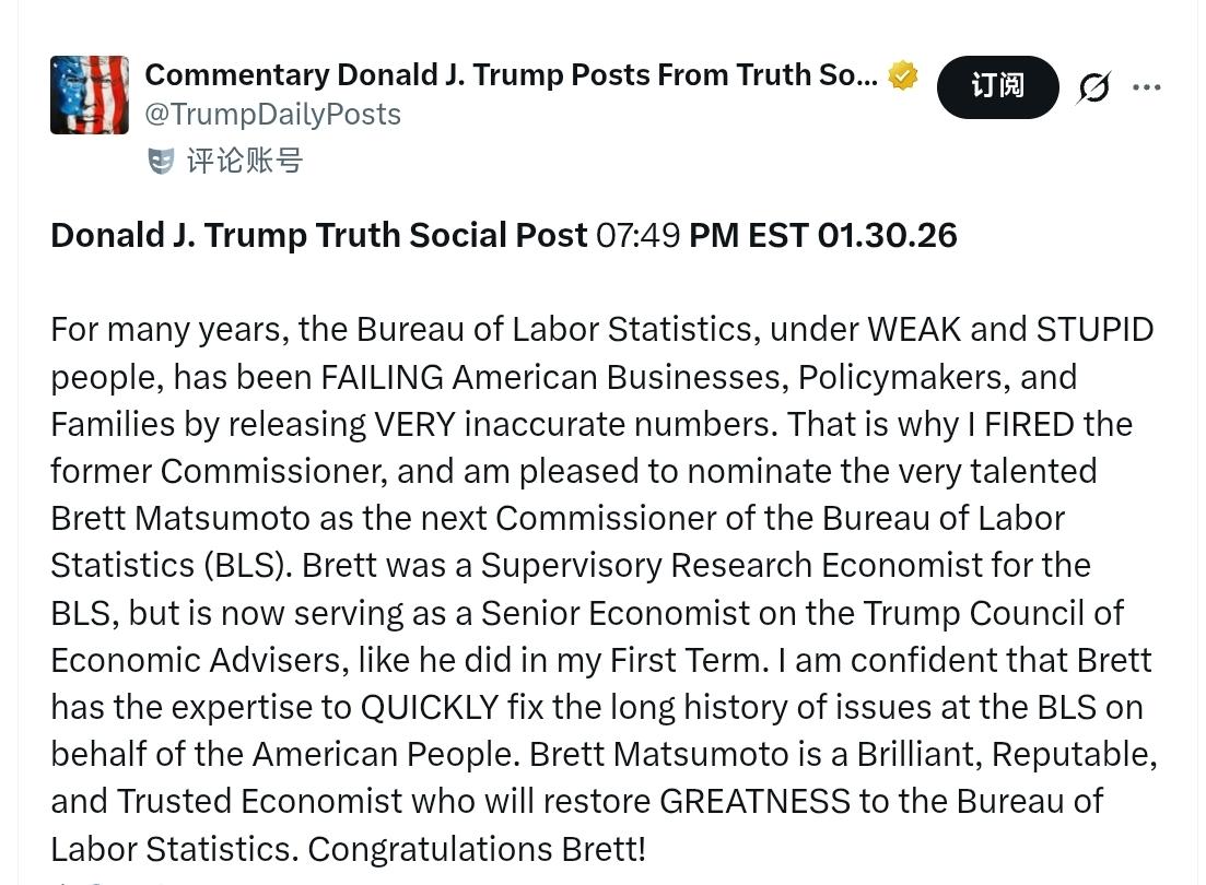 特朗普:多年来,在软弱无能之辈的领导下,美国劳工统计局发布严重失实的数据,令美国企业、政策制定者和家庭蒙受损失。正因如此,我解雇了前任局长,并欣然提名才华横溢的布雷特·松本担任下一任劳工统计局局长。布雷特曾任劳工统计局主管研究经济学家,如今担任特朗普经济顾问委员会高级经济学家,正如他在我的第一任期内所做的那样。我相信,布雷特拥有丰富的专业知识,能够迅速解决劳工统计局长期存在的问题,造福美国人民。布雷特·松本是一位杰出、声誉卓著、值得信赖的经济学家,他将重振劳工统计局的辉煌。祝贺布雷特!