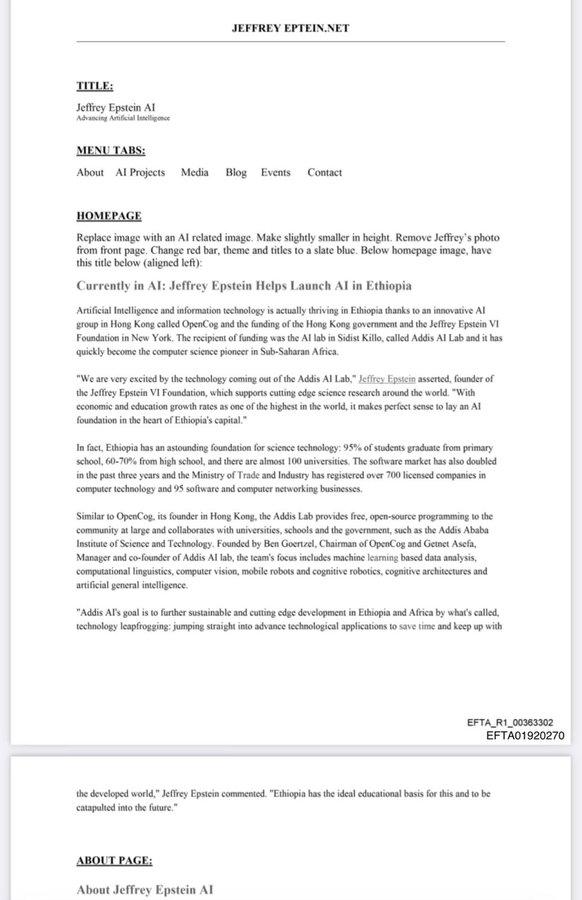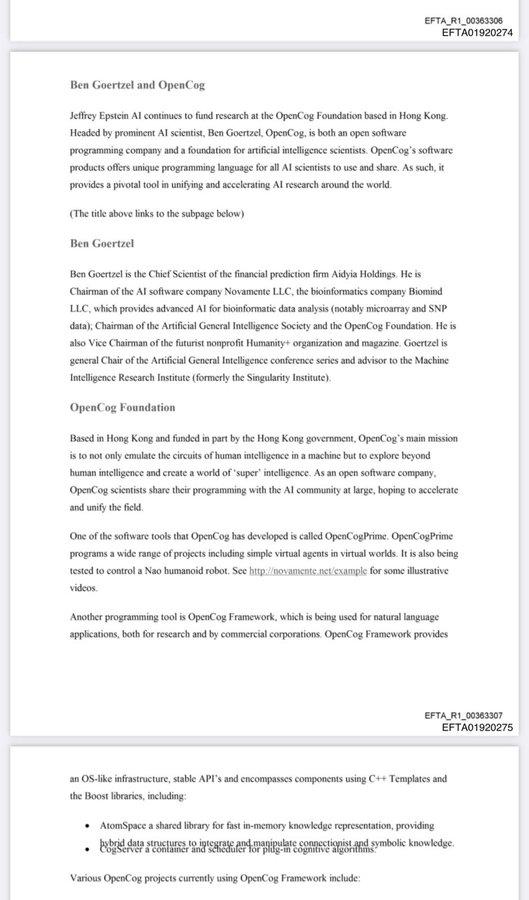 爱泼斯坦的隐秘人工智能帝国曝光,资助了OpenCog和情感机器人项目 爱泼斯坦通过他的基金会大力资助尖端人工智能研究,支持了 OpenCog(由 Ben Goertzel 领导的总部位于香港的开源通用人工智能项目)和埃塞俄比亚的 Addis AI Lab,他帮助创立了 Addis AI Lab,使其成为撒哈拉以南非洲的计算机科学先驱。 他向 MicroPsi 项目投入了大量资金,为虚拟世界中的情感驱动代理编写了超过 60,000 行代码,旨在建立一个无需昂贵机器人技术的统一认知理论。 来源:美国司法部