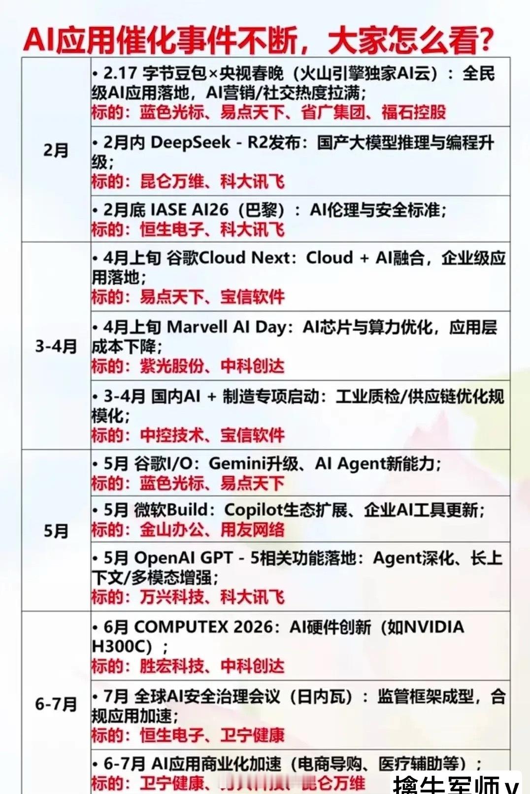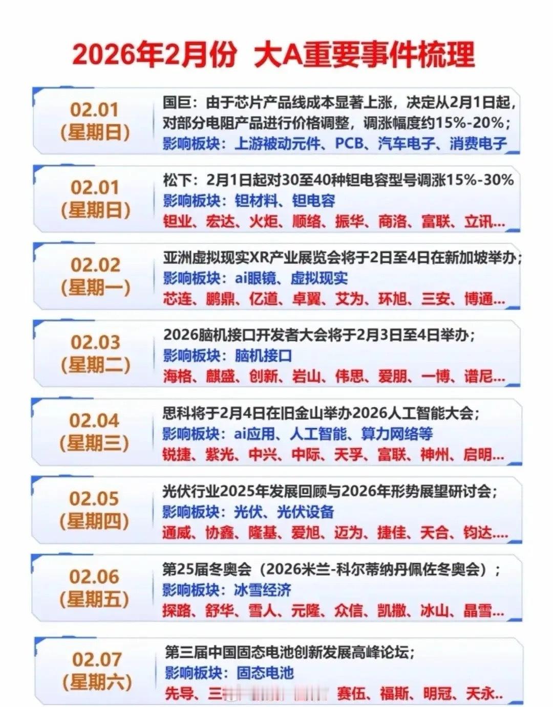 2026年2月大A重要事件+全年AI催化前瞻,为你梳理投资日历,哪些板块值得提前埋伏?相关概念龙头代表有哪些?2026全年AI催化事件前瞻,从全民级应用到全球技术峰会,从2月字节豆包登陆春晚引爆全民AI热度,到DeepSeek-R2推动国产大模型升级,再到谷歌、微软的年度技术大会带来的AI Agent、Copilot生态新突破,一整年的AI催化事件已经排满。AI人工智能概念龙头代表有科大讯飞、宝信软件等等。2026年2月3日脑机接口开发者大会(天津)召开,会议主题神经康复、医疗设备落地推进,关注创新医疗、三博脑科、汉威科技等。风险提示:以上内容仅为事件梳理,不构成投资建议。