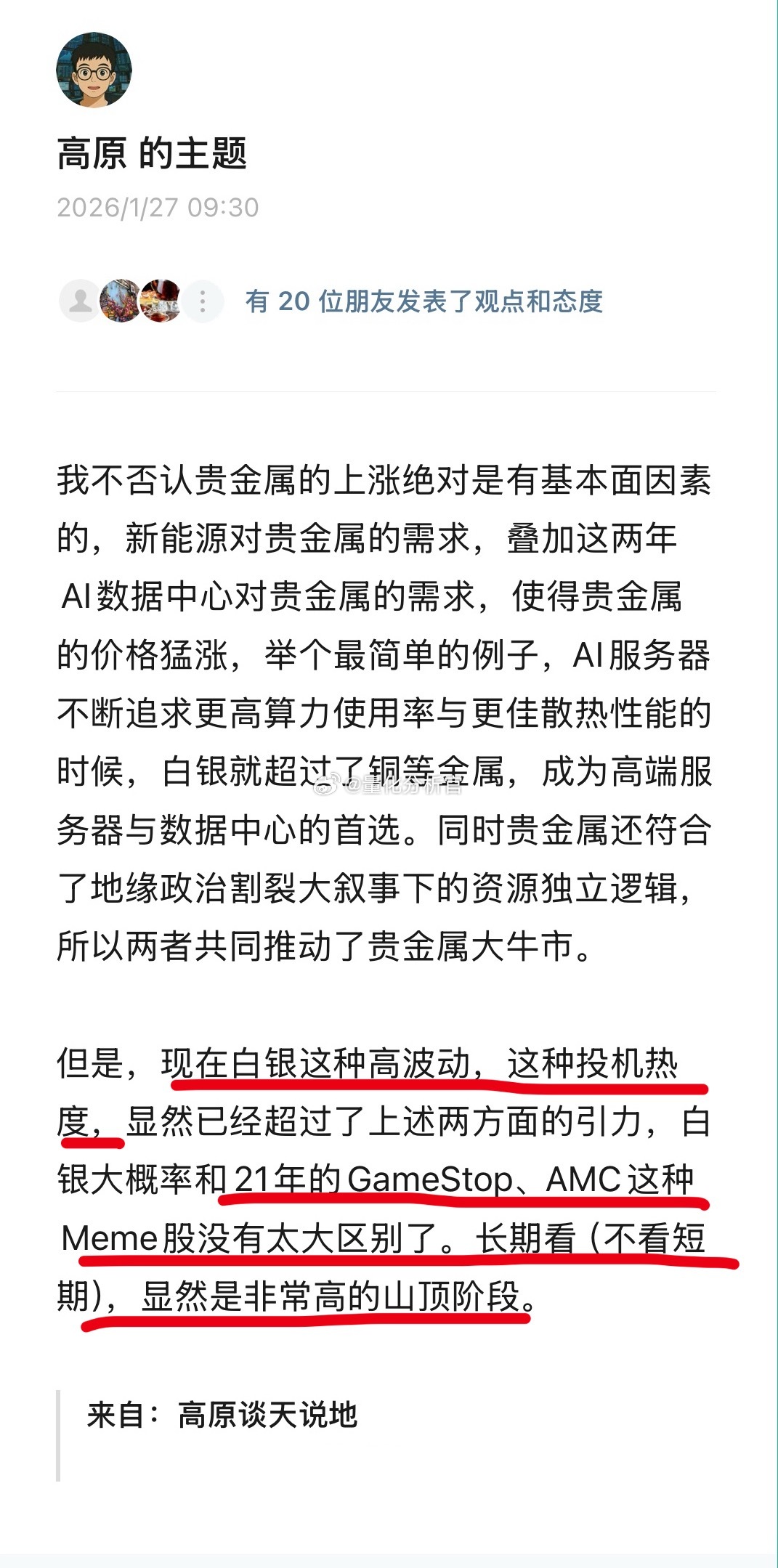 人民经济学家量化分析官高原,在白银暴跌前无数次提示大家注意贵金属的风险,可以说是苦口婆心了