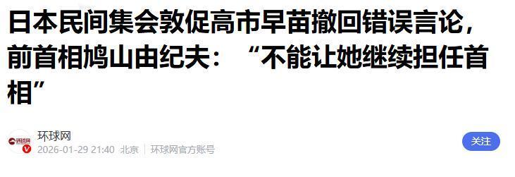 2026年1月的东京,就在众议院大选的黄金拉票时间段,消失政坛多时的前首相鸠山由纪夫突然出现在大阪街头,高举麦克风喊出一句惊人之语:“不能让高市早苗再当首相!”现场一片哗然。 就在外界刚刚习惯高市强硬作风之时,鸠山的猛然出击,显然踩了日本选战最敏感的那根神经。到底是什么,让这位长期主张理性外交、曾推动中日关系缓和的政坛老将选择在关键时刻高调发声? 了解鸠山不难发现,他一贯主张对华合作、区域协调的“东亚共同体”理念,而高市早苗则是日本政坛中最典型的“鹰派”人物之一。近几年来,高市的表态一次比一次“硬核”:参拜靖国神社问题上坚定站队、在历史问题上回避道歉、对中国多次释放挑衅意味的外交语言。 或许正因为如此,鸠山才按捺不住。不只是个人恩怨,他放出狠话的背后,实际上已经把整场选战引入了“路线之争”的核心。 高市强调日本要强化防卫、深化与美国的安全合作关系。她主张修宪,扩大自卫队权力,多次在公开场合持“对外强硬、对内加强”的姿态。许多保守派媒体,例如《产经新闻》,纷纷造势称高市是“捍卫国家尊严”的代表。 鸠山却认为,如果让高市这样的人物再次获得首相提名资格,日本的外交政策将不可逆转地向单边主义倾斜,这不仅削弱本国经济韧性,也会加剧地区不稳定。他担心历史的老路又将重演——对抗为主,合作靠边,损失的不是政客的面子,而是千千万万日本企业和普通民众的饭碗。 举个最直观的例子。据日本财务省统计,截至2025年底,中国仍是日本第一大贸易伙伴。双边贸易额占到了日本外贸总总额的21.5%,涉及制造业、旅游、电信、电子等多个支柱行业。当年日本企业对华出口在一个季度内骤降22.1%,至今仍是日企内部案例课的警示教材。 鸠山的逻辑是明确的:如果一味陷入意识形态对抗,很可能捡了民族主义的面子、砸了自家产业的饭碗,对中小企业尤其致命。 民调显示,接近48%的受访者认为日本“不宜在外交政策上采取过于对抗的态度”,其中以中青年中产阶层最为明显。这一群体多为企业职员、跨国公司从业人员,身处供应链连接地带,对外部关系体感尤为敏锐。 但也非所有人都买账。保守派媒体《读卖新闻》则刊文讽刺称,鸠山言论“早已被现实抛弃”,呼吁选民“擦亮眼睛区分谁才是国家真正的捍卫者”。高市本人在面对媒体时,对鸠山的喊话轻描淡写,回应称“这是民主社会的声音之一”,但背后的含义——完全不当回事。 事实上,选战走到现在,支持者基本固化,鸠山此番动作对选民格局可能影响有限。但对那些原本模棱两可的中间选民,尤其是受经济问题牵动的群体,煽动效应正在发酵。 日本若长期强化与美国的绑定,并在历史问题上转硬,势必让中韩警觉,可能挑起区域外交“寒流”。外交关系学者埃文斯在《外交事务》月刊中曾写:“亚洲不是站队游戏场,谁挑头对抗,受伤的往往不是对手,而是区域整体合力。” 日本大选不只是日本人的“家务事”,它已经悄然演变成影响整个东亚政治气候和经济大局的关键变量。 鸠山由纪夫此时发声,不在于几个选票的得失,而在于他想告知选民一句话:政治的未来,是方向抉择。 日本究竟会向“合作外交”和“经济联动”的方向延续,还是走入“强硬对峙”与“安全焦虑”的老轨道?这是一张账单写在每一个小微企业的订单上、写在每一台出口电子产品的表上。几秒钟一张选票盖下,不只是一道选择题,更是下一代发展的试卷答案。 日本民间集会敦促高市早苗撤回错误言论,前首相鸠山由纪夫:“不能让她继续担任首相”——2026-01-29 21:46·环球网