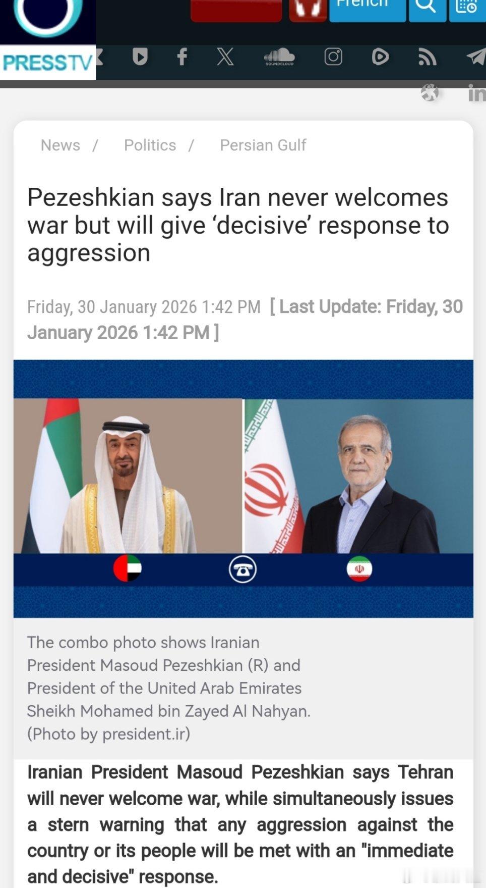 他补充说,伊朗的做法是基于国际法、相互尊重以及避免威胁和使用武力来解决问题的互动和对话。然而,伊朗总统强调,任何针对该国和民族的侵略行为都将“立即且果断”予以回应。 (伊朗官网)