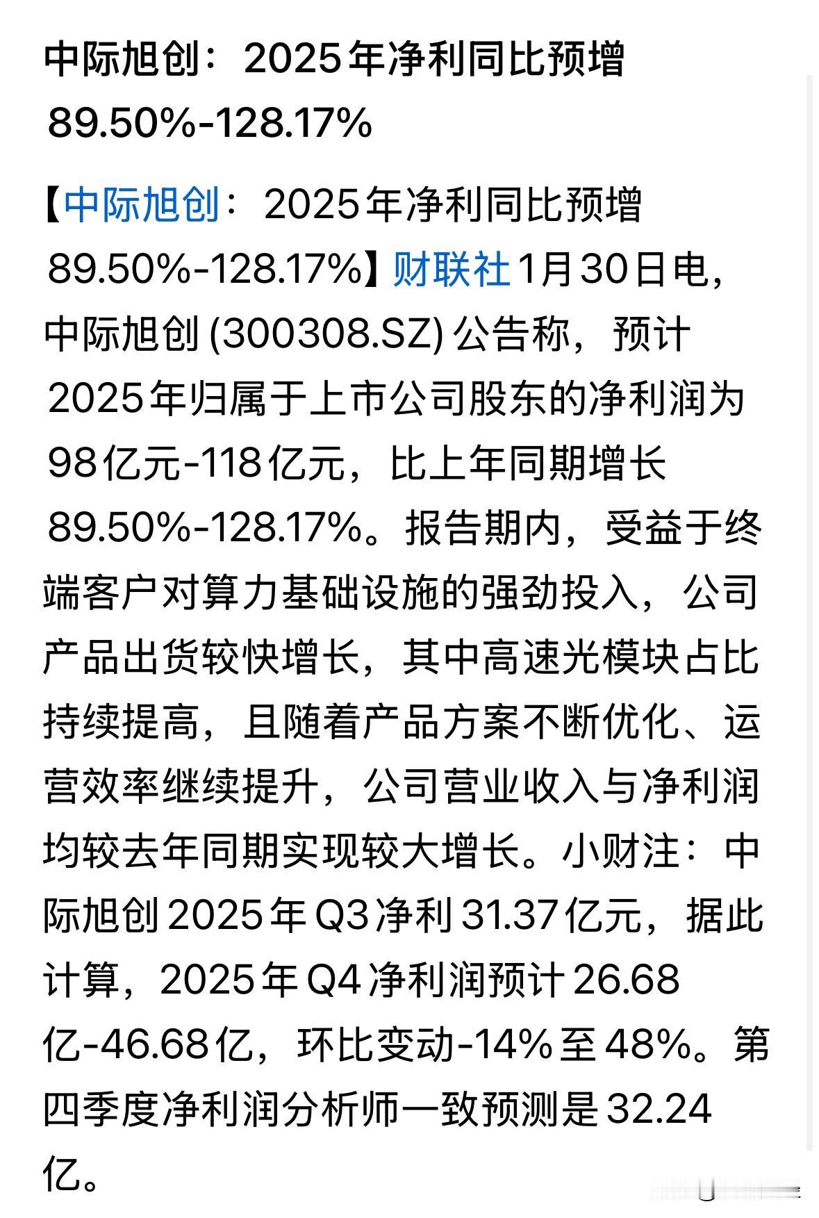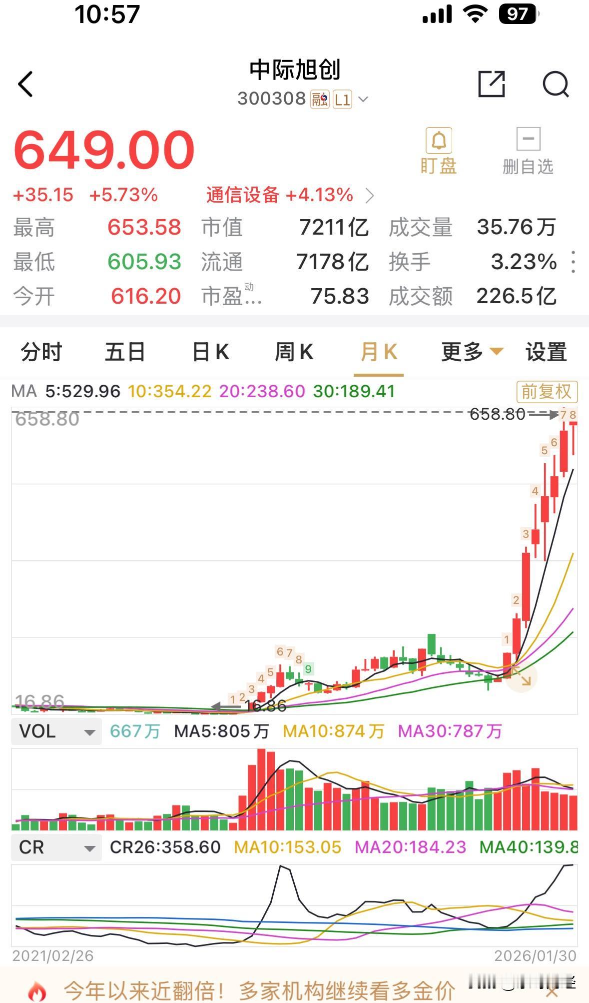 中际旭创上涨5.73%,因业绩大增,历史性首次跨入百亿净利润行列。 据昨公告,其2025年净利润为98亿元至118亿元,取中位数为108亿元。 目前中际旭创的总市值7211亿元,市盈率已下降到66倍。 而个股股价在月线形态上体现出九连涨,没有最高,只有更高,股价已经近乎上涨1000%。 个股一旦处在风口上,果然没有上限。 目前在高位震荡徘徊,此份历史性的百亿净利润业绩,会否成为发令枪,拭目以待。 乐呀财经