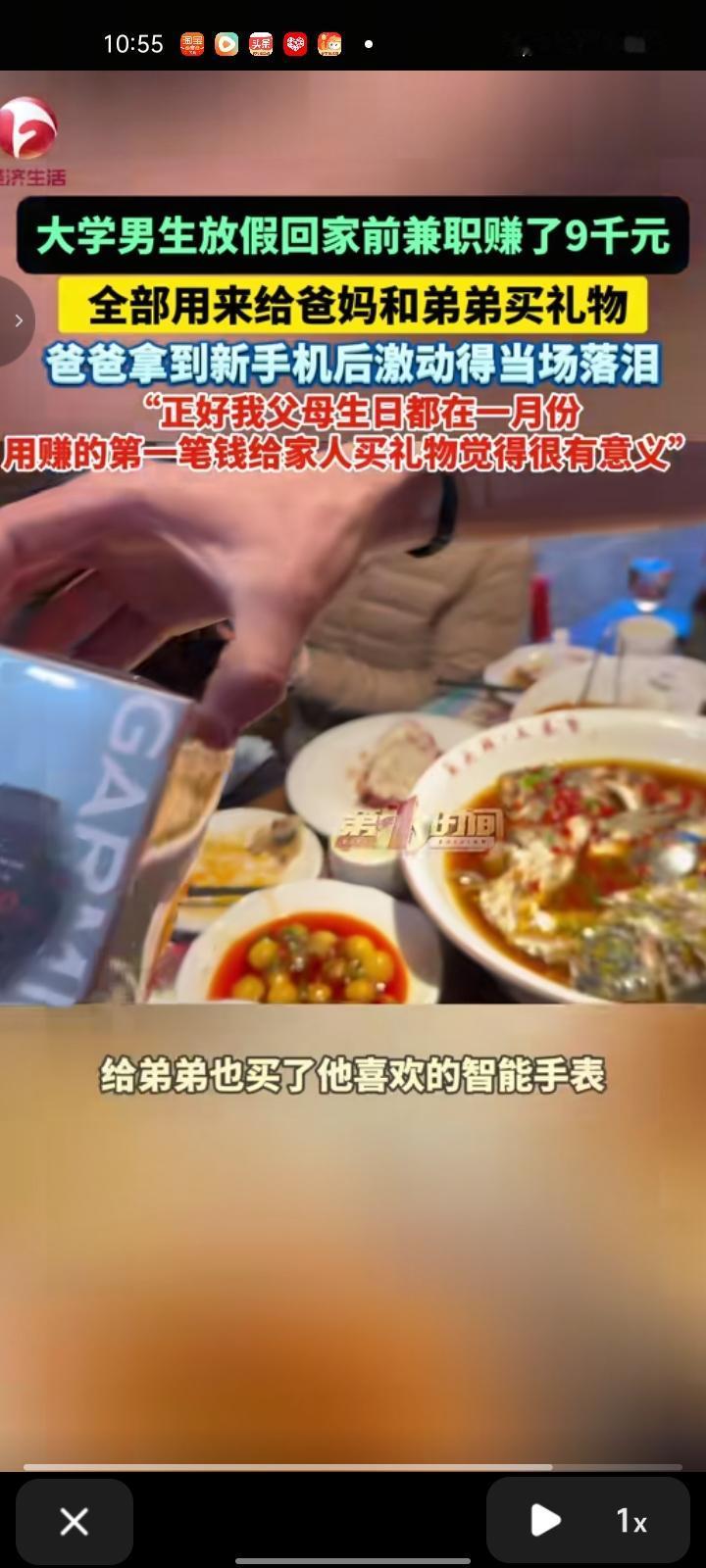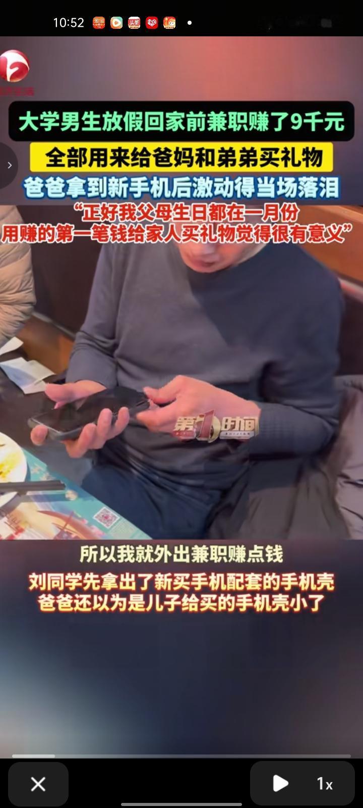 1月21日,山东菏泽。男生放假回家前做兼职,就是去超市当配送员,干了三个月赚了9000元,全用来给爸妈和弟弟买礼物。视频中,他拿出新买的手机配套和手机壳,爸爸以为他买的手机壳小了,这时他拿出新买的手机,屏幕大且不伤眼,爸爸看到后激动的落泪。此外,还给弟弟买了他喜欢的智能手表。 当事男生表示,正好父母的生日是一月份,用赚的第一笔钱给家人买礼物很有意义。