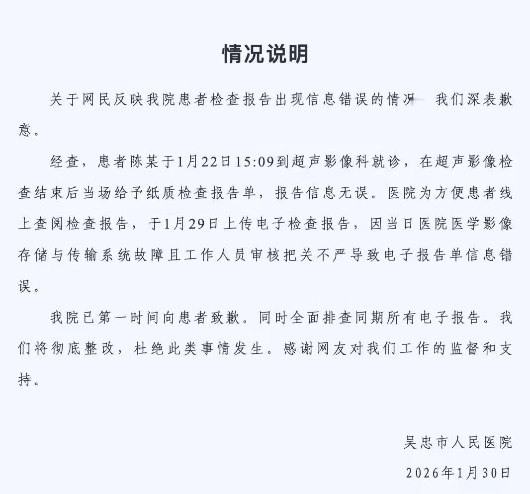 这家医院真滑稽,竟让73岁大爷怀孕了![笑哭] 笑死我了!73、84,已经到了爬坡过坎年龄的大爷,居然在这家医院里怀孕了! 1月30日,有网友发文称,73岁大爷因心脏不适到宁夏吴忠市人民医院检查,超声检查结果显示:宫内早孕,不排除胚胎停育可能。 对此,该医院发布声明说,超声检查没有错,只是工作人员上传电子版时弄错了(图片)。 天爷爷,一句轻描淡写的弄错了就想过关了。 其实,人们对此担心的是,救死扶伤的人民医院竟然工作起来如此马虎,这是最可怕的。 因为身体原因,我经常需要做些血液化验,每次基本上都不等待化验结果,只是在手机上进行查询。只要化验指标没有明显异常就不再去医院打印纸报告。 看到这则消息,直让我惊出一身冷汗,真的不知道,我的电子化验单是不是我的。看来,这是真的不能马虎!