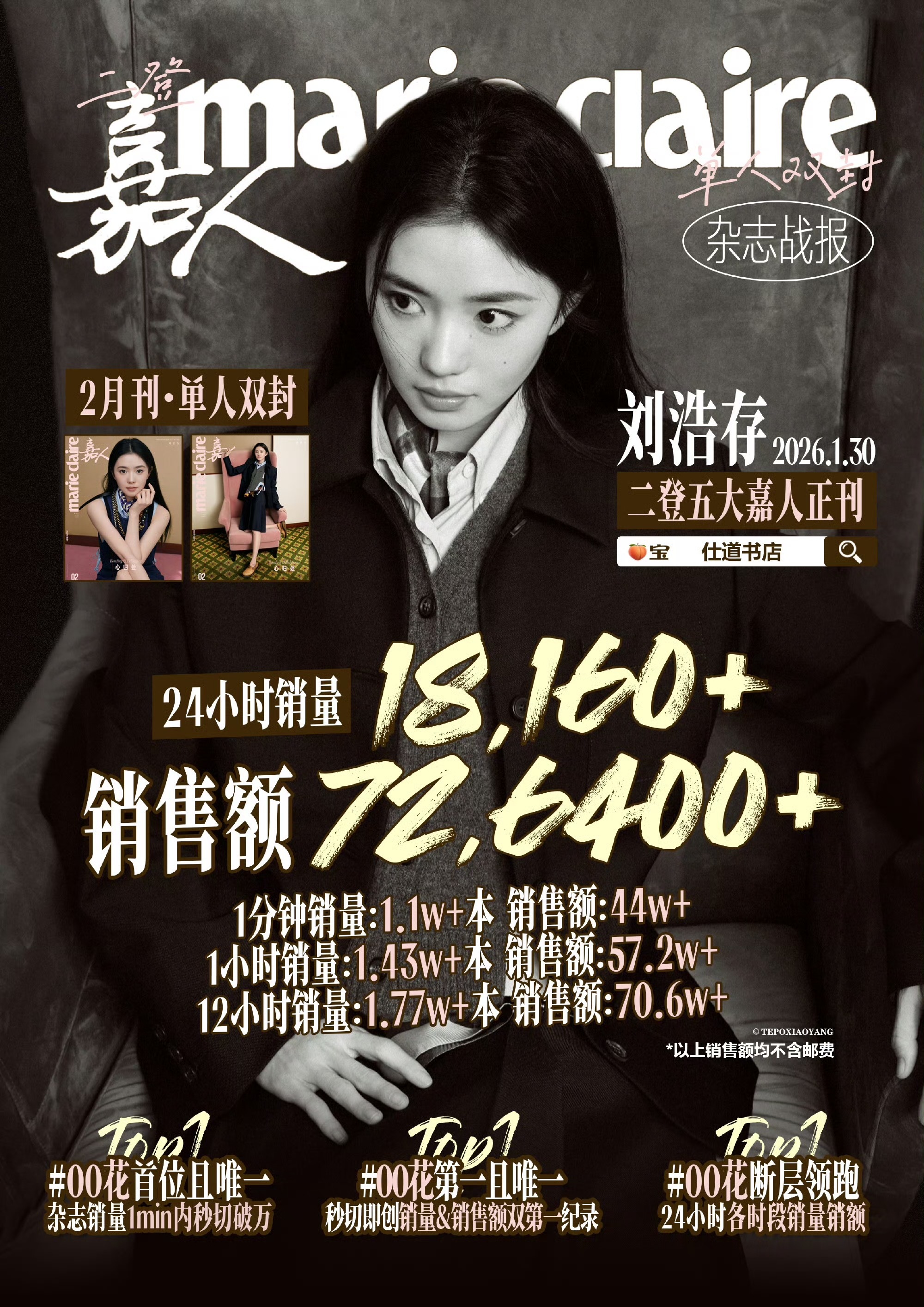 刘浩存二登《嘉人》首日战报来了,00花杂志卖了72万真的很牛 ,创下了00花第一且唯一秒切以及创销量&销售额双第一纪录