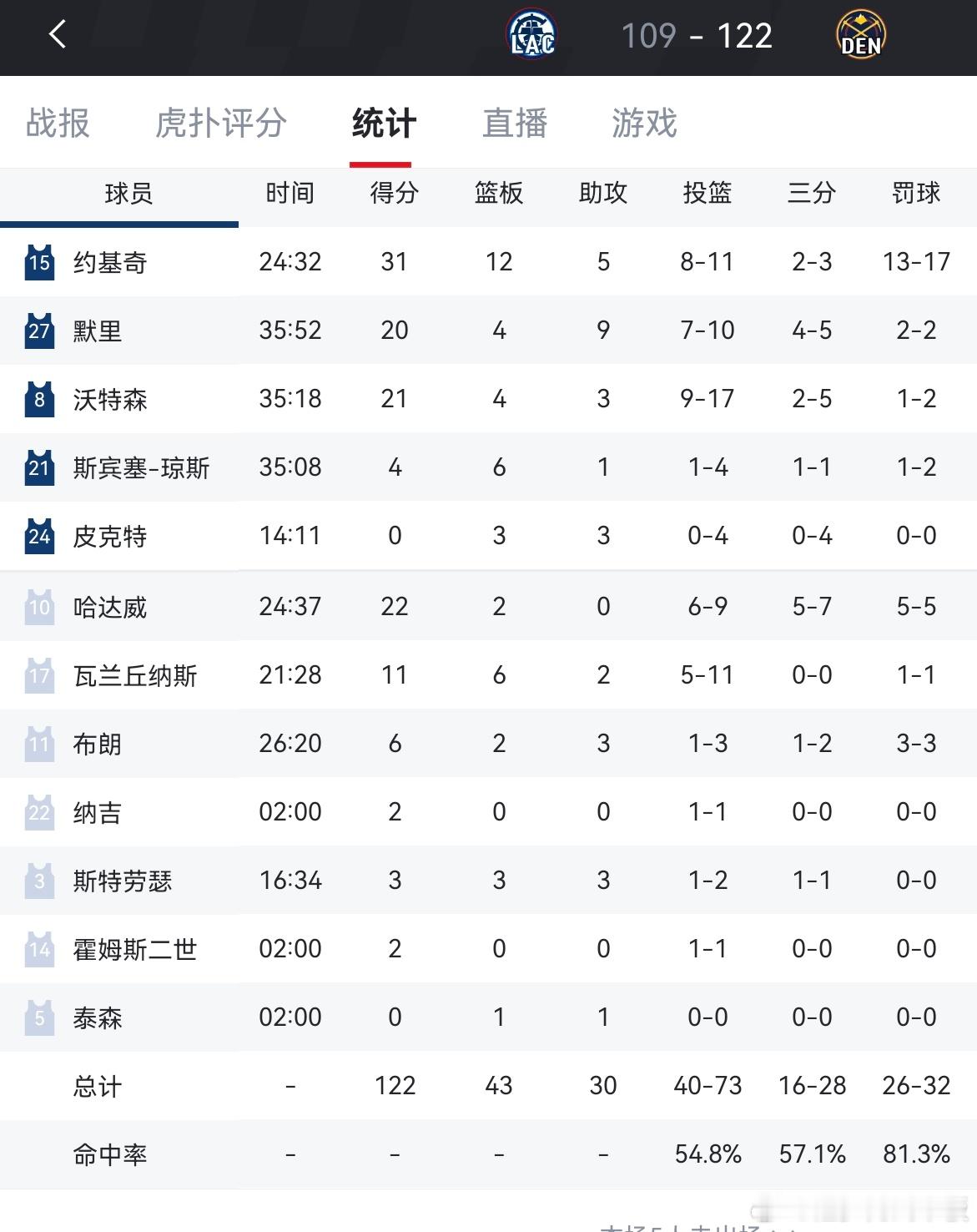 约基奇复出砍下31分12板5助,掘金轻取快船!快船三连胜被终结