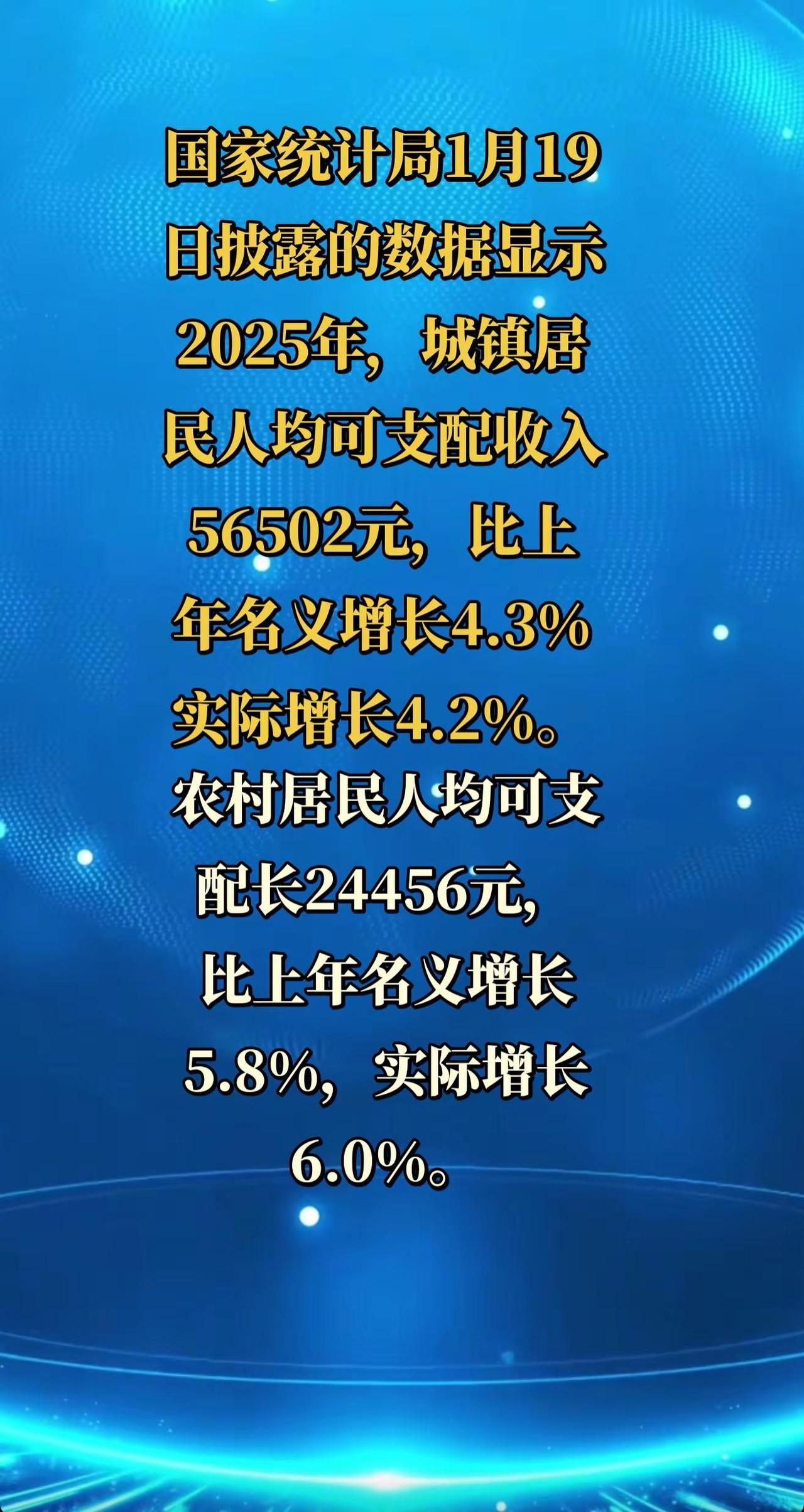 中国国家统计局19日披露的数据显示2025年,城镇居民人均可支配收入56502元,比上年实际增4.2%;农村居民人均可支配收长24456元,比上年实际增长6.0%。