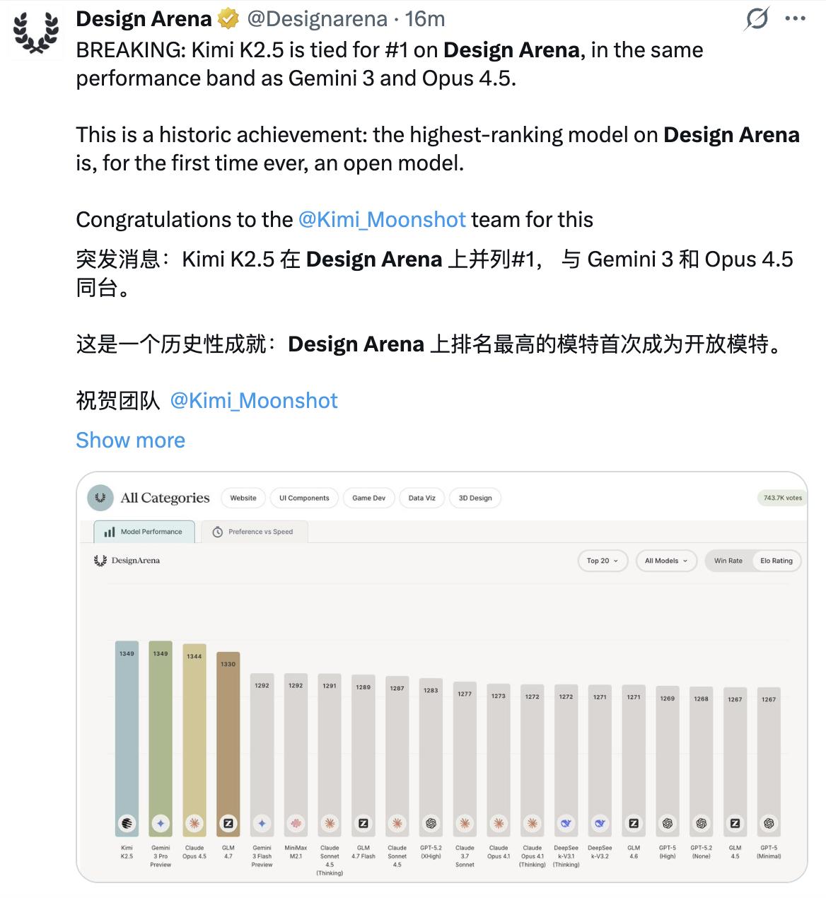 又一家硅谷独角兽「反水」了。 这次是 Kilo Code。 关注AI编程的朋友对这名字应该不陌生,这是现在 Cursor 最头疼的对手,上线才9个月,处理的 Token 量就干到了恐怖的 20 万亿,还拿了硅谷顶级VC General Catalyst 前的800万美金融资,妥妥的硅谷新宠。 但这两天有个事儿很有意思,真的让我觉得风向变了。 Kimi K2.5开源之后,Kilo Code 几乎是秒速接入了。而且看后台数据,就这么短短3天,Kimi 的调用量直接冲到了第一,把 Grok 和 Claude Sonnet 4.5 全给挤下去了。而且还不止他一家,今天Openrouter上的用量里,K2.5也进入了Top3。 最好笑的是,Kilo Code还发了篇推文,专门拉踩Claude Opus 4.5,这是有多大仇啊,感觉主要就是嫌他封闭和贵。 但这件事,真正让我觉得有意思的,是这种「摇摆州」的既视感。 以前我们总觉得,硅谷是 OpenAI 和 Google 的「铁票仓」。在那边混,你要不是 Powered by GPT 或者 Claude,出门都不好意思跟人打招呼。那是「政治正确」。 但现在,这帮最硬核的开发者,变得越来越像美国大选里的「摇摆选民」一样。 谁能帮我搞定问题,谁便宜,我就投谁。要论性价比,放眼全球的AI公司,那确实是中国大模型最卷,又卷性能又卷价格的。 去年的Deepseek就不用说了,这次的Kimi K2.5也是,在「Artificial Analysis」的指数里,登顶全球开源第一。 在AI设计界的奥斯卡榜单「Design Arena」上,更是直接把Gemini 3 Pro拉下马,成为第一个拿下榜首的开源模型。关键人家的价格只有 Claude 的 1/7,面对这种「降维打击」,什么地缘、什么出身,在真金白银的算力账本面前,都得往后稍稍。 我一直有一个感觉:国产大模型的最终出路可能真的是和硅谷的闭源模型打成本战。 虽然现在很多人都看不上国产模型,觉得只是平替,但随着模型性能的不断追平,当硅谷的「摇摆州」开始集体把票投给中国AI时。 这事儿就不仅仅是「国产替代」那么简单了,可能会成为全球编程工具甚至是生产力行业的 「标准配置」 。