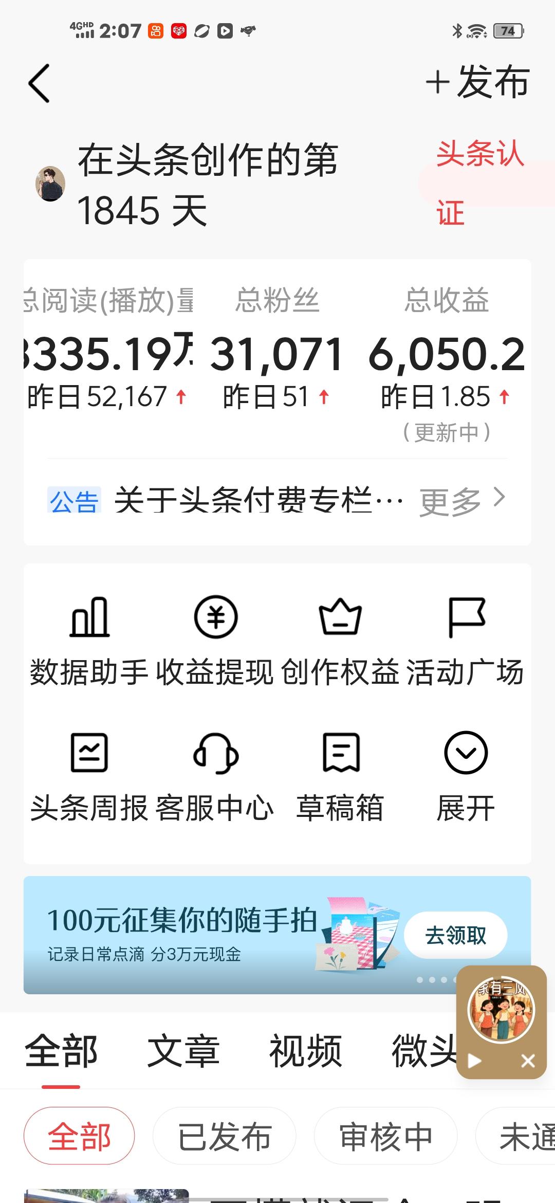 5万多阅读量涨粉51个收益1块8毛多钱,够不够买一个大馒头。