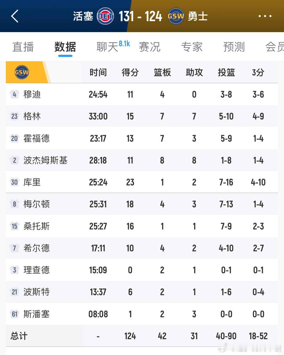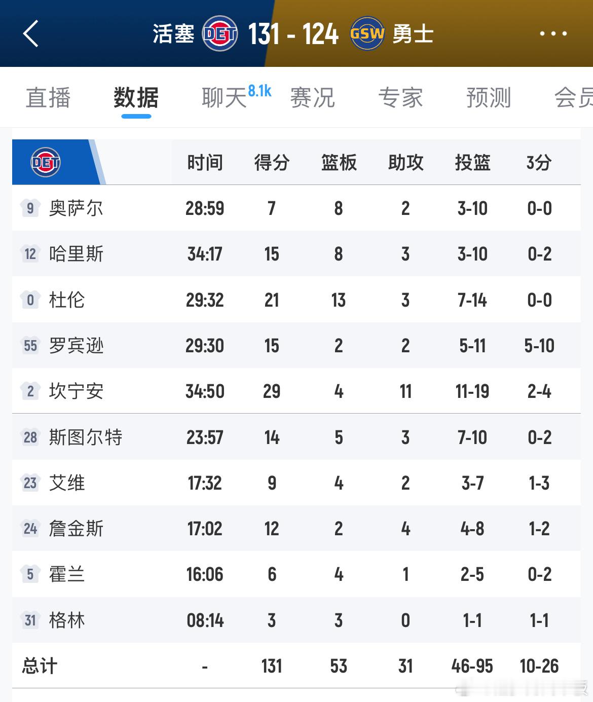 坎宁安29分3篮板11助攻,杜伦21分13篮板7助攻;库里23分2助攻。活塞vs勇士