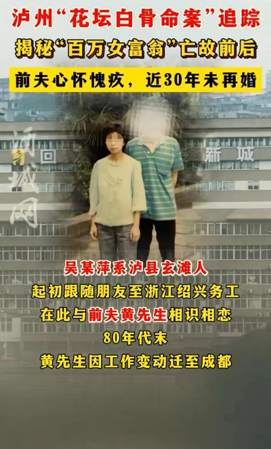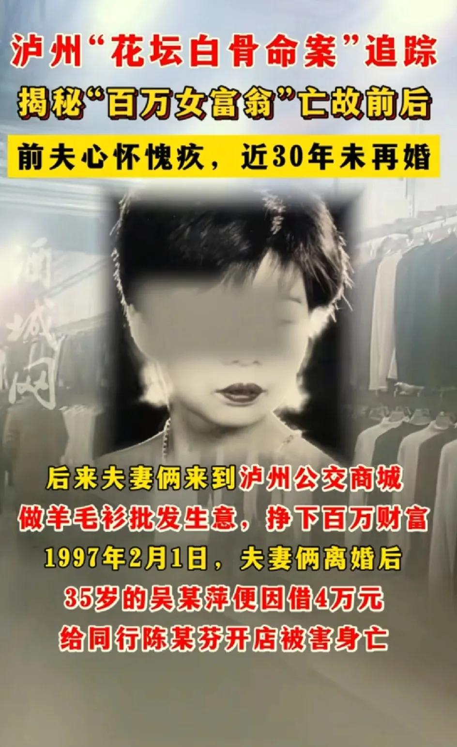 强烈呼吁两名犯罪分子死刑。 被害人吴某萍的儿子黄平,今年39岁了,已婚,有一个14岁的孩子。他的父亲黄福千一辈子都没有再婚。黄福千是一名老兵,没有找到前妻的这些年,他和儿子都不知道吴某萍到底怎么了。是离家出走不要儿子了吗?而现在黄平终于知道了一个确定的答案,妈妈不是不要他了,而是被别人害了。 那年,黄平11岁,他在商场找了妈妈两年,他总觉得妈妈会回来。 妈妈那么爱她,却突然不见了。对于一个孩子来说天都塌了。 1997年泸州的职工平均工资才四五百块,吴某萍能借4万块钱给自己的同行(犯罪嫌疑人陈某宇)可见她多么的善良大方。所以说财不外露,不要对外人那么大方,那么好。指不定对方就是白眼狼。吴梦萍被陈某宇和她的前夫杨某根骗到商场的4楼。杀害之后抢了她的金银首饰,把她抬到9楼的楼顶,放在一个小小的花坛里面,身上压了四五百斤的土,并且把花坛用瓷砖封死。坏人就是这么对待自己恩人的。 陈某宇整了容,连身份证号码都改了,后来从她亲哥哥那里知道了她的微信和地址。 陈某宇被锁定之后限制出境,她在尝试去韩国被拒后居然主动联系工作人员。说要消除误会,看她心里多强大。