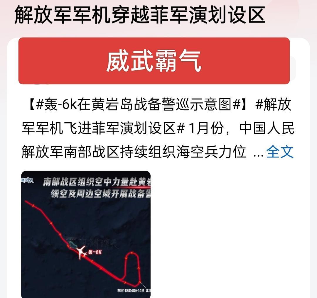 威武霸气!中国军机穿越菲军演划设区!菲律宾单方面非法划设军演区域,妄图觊觎黄岩岛主权,真的是有点太不自量力了,蚍蜉还想撼大树,终究只是徒劳和笑料。 黄岩岛自古就是中国固有领土,主权归属没有半点儿置疑,决不允许任何外部势力觊觎挑衅。解放军果断出动军机巡航黄岩岛,径直穿越菲方非法划定区域,此举恰如利刃出鞘,锋芒尽显,以雷霆之势亮明捍卫领土主权的坚定立场。用实际行动击碎一切挑衅图谋,让别有用心的算计无所遁形,有力震慑任何侵权行径,坚决守护国家领土完整。