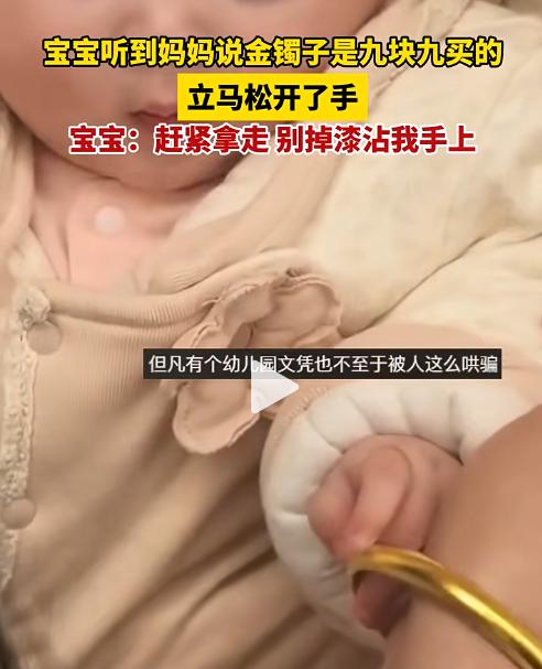 笑不活了,宝宝盯着妈妈的金镯子,眼看马上就要垂涎欲滴了,妈妈说这镯子是九块九买的,宝宝听到以后立马松开了手。宝宝:赶紧拿走别掉漆沾我手上网友:但凡有个幼儿园文凭也不至于被骗   近期,一段萌娃与妈妈金镯子的趣味互动走红网络,全程笑点拉满,网友看完纷纷调侃:“但凡有个幼儿园文凭,也不至于被妈妈骗得这么惨”。 原本对着金镯子垂涎欲滴的小宝宝,被妈妈一句“9块9买的”劝退,秒松小手的模样,既可爱又搞笑,治愈了无数网友。 画面里的小宝宝年纪不大,刚学会坐稳,对身边的一切都充满好奇心,尤其喜欢盯着亮晶晶的东西。这天,妈妈坐在宝宝身边陪玩,手上戴着的金镯子无意间露出,圆润的光泽、晃动的质感,瞬间吸引了宝宝的全部注意力。 宝宝的目光牢牢锁定妈妈的手腕,眼睛瞪得圆圆的,眼神里满是向往,嘴角微微上扬,甚至隐约露出要流口水的模样,一副“我超想要”的乖巧又贪婪的样子。 他慢慢伸出小手,小心翼翼地凑近金镯子,指尖轻轻触碰了一下,又快速缩回来,像是在试探这个亮晶晶的东西是不是“好东西”。 反复试探几次后,宝宝的胆子大了起来,伸手就要去抓金镯子,小手紧紧盯着目标,生怕错过。妈妈见状觉得十分有趣,故意逗宝宝, 谎称这个看起来质感十足的金镯子,是花9块9买的便宜货,还故作认真地叮嘱宝宝,别碰太久,免得掉漆沾到手上。 万万没想到,原本还对金镯子爱不释手、差点垂涎欲滴的宝宝,听完“9块9”的说法后,反应瞬间反转。他思索了一番,快速缩到身后,还下意识地蹭了蹭手指,那嫌弃又警惕的小模样,反差感拉满,仿佛在说“赶紧拿走,别掉漆沾我手上”。 妈妈将这一幕完整拍了下来,发到网上后,很快引爆全网,收获了大批点赞和评论。小宝宝的真实反应,戳中了大家的笑点,不少网友调侃,这届宝宝也太现实了,一听是9块9的便宜货,瞬间失去兴趣,主打一个“不沾廉价东西”。 还有网友脑洞大开,替宝宝吐槽:“但凡有个幼儿园文凭,也不至于被妈妈这么忽悠”,也有网友分享自家娃的同款趣事, 坦言小朋友对“价格”似乎有着天生的敏感度,贵的东西格外珍惜,一听是便宜货就瞬间嫌弃。更有网友调侃,妈妈这招“反向劝退”太绝,轻松守住了自己的金镯子。 其实,小宝宝的反应并非真的懂价格,更多是被妈妈的语气和“掉漆”的叮嘱影响,下意识地做出回避的动作,这份天真又真实的模样,正是最治愈人的地方。 如今,萌娃趣味日常越来越受大家喜欢,简单的小互动,既能给大家带来欢乐,也能治愈生活中的疲惫。 这段视频走红后,不少网友纷纷转发,调侃宝宝的现实与可爱,也佩服妈妈的机智。看似简单的一段日常互动,却藏着满满的温情与趣味,成为大家枯燥生活中的一抹小欢喜。对此,你们有什么看法,欢迎评论留言~