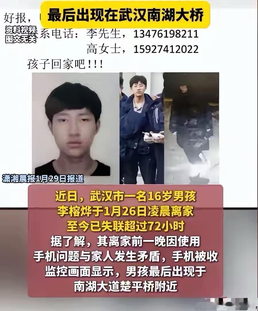 又是手机!武汉16岁高中生李榕烨因为周末通宵玩手机,父母一生气把手机给没收了!1月26日凌晨孩子半夜趁父母睡着后,独自离家出走了,目前失联已经超过5天时间!当天是周六,父母发现孩子通宵玩手机后,就把手机给收了,当时孩子也没说什么,只是谁也不理,周日还玩了一天的电脑!周一也就是26日,早晨发现孩子已经不在屋里,查看监控,发现孩子是凌晨离开的家,走的时候没有带手机也没有带现金!监控显示,孩子在南湖大桥中段停留了一会儿,然后就进去了监控盲区,附近和大桥下都已经寻找过了,并未发现孩子的踪迹!李榕烨身高1.72米,戴着白框眼镜,穿着中长黑色羽绒服,藏青色带白条的裤子,脚穿灰色反光运动鞋!大家都留意一下这个孩子,如果见到请及时与他的家人联系!如果看见请拨打电话。