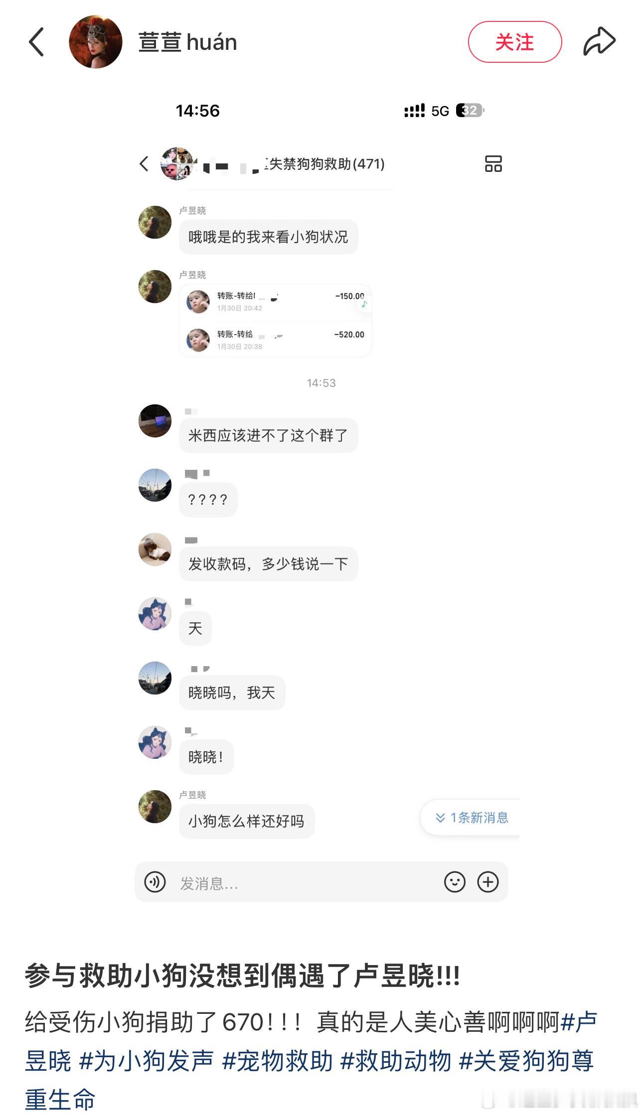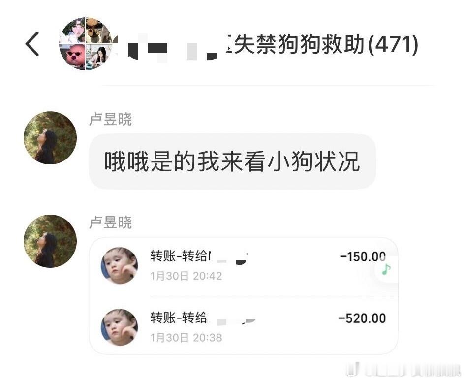 卢昱晓为受伤小狗捐款 网友参与救助小狗偶遇卢昱晓,给受伤的小狗卷轴了670元,群友担心姐妹被骗在群里问了一下,才知道是卢昱晓卷住的,噜噜晓真是天使来的