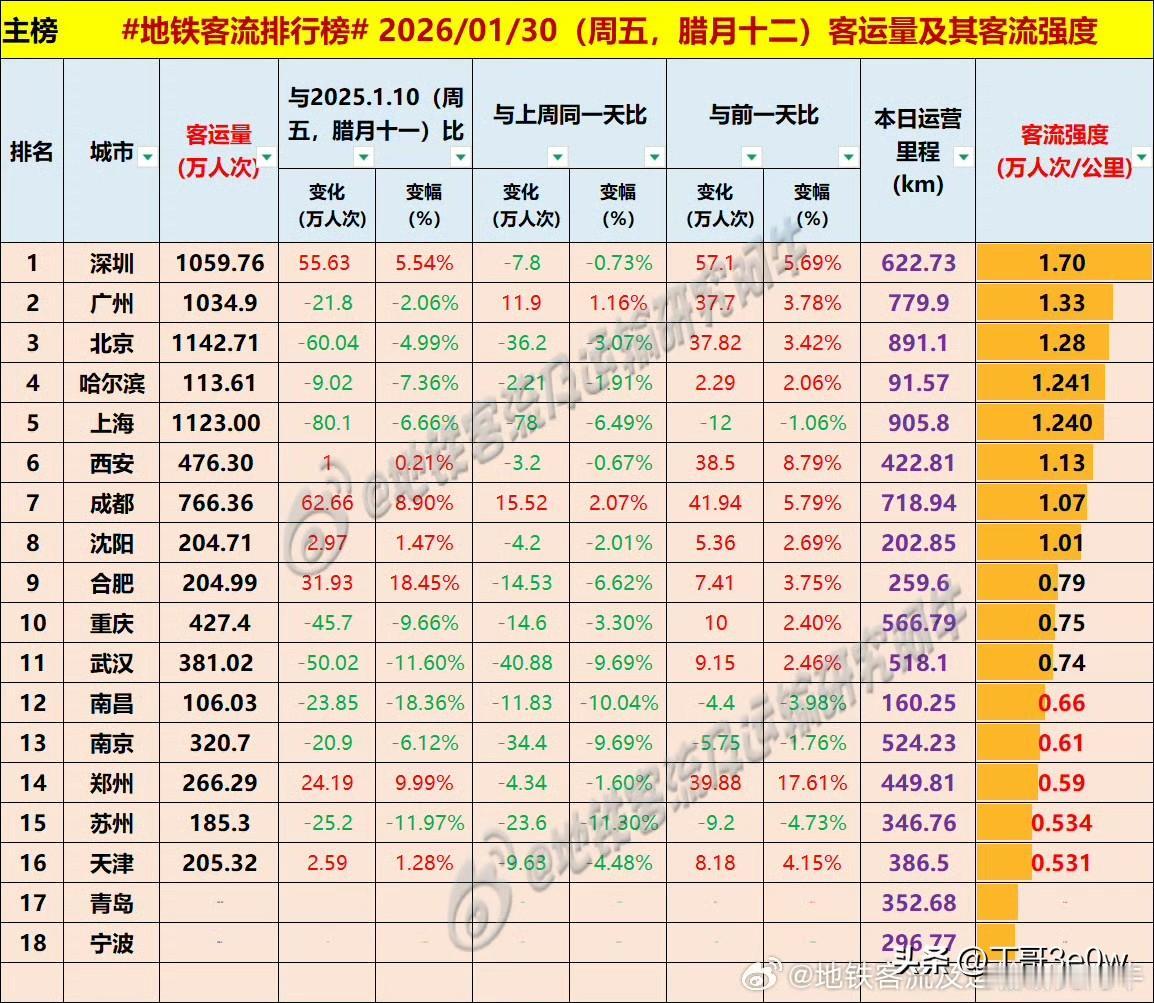 深圳、广州地铁客流量周五同超千万人次,深圳继续超过广州[呲牙][呲牙][呲牙] 爆料 身边事 地铁客流排行榜 中国地铁客流日报 昨日客流 排行榜 周五 深圳 广州 2026年1月30日 星期五 全国重点城市轨道交通客流量排行榜: 北京:1142.71万北京爆料 上海:1123.00万 深圳:1059.76万 广州:1034.90万广州地铁 成都:766.36万成都爆料 西安:476.30万 重庆:427.40万重庆身边事 武汉:381.02万武汉地铁 南京:320.70万南京地铁 郑州:266.29万 天津:205.32万天津身边事 合肥:204.99万合肥爆料 沈阳:204.71万沈阳地铁 苏州:185.30万 青岛:113万+青岛身边事 哈尔滨113.61万哈尔滨爆料 宁波:106万+宁波地铁 南昌:106.03万