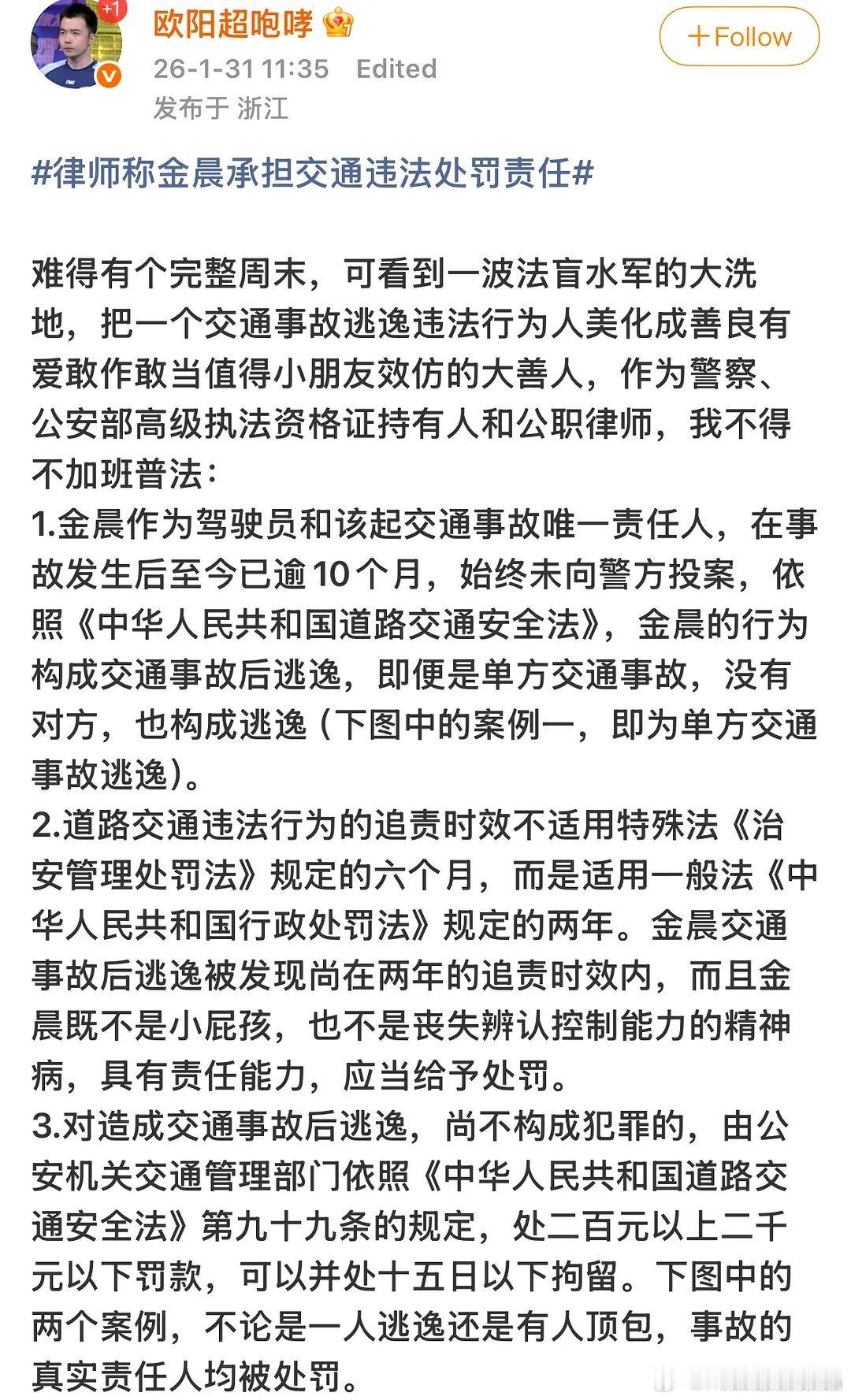 真正做过👮的欧阳超出来发表对jc这件事的看法了,法律面前应该人人平等。金晨助理已触及行政违法
