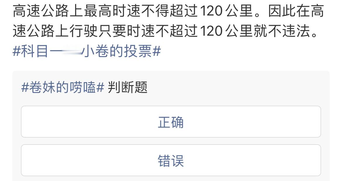 有不少小伙伴选择了正确,但题目中的描述忽略了车型和路段差异,例如货车、客车、危险品运输车要求最高100公里/小时,所以正确答案应该选错误。所以你答对了吗?科目一卷妹的唠嗑