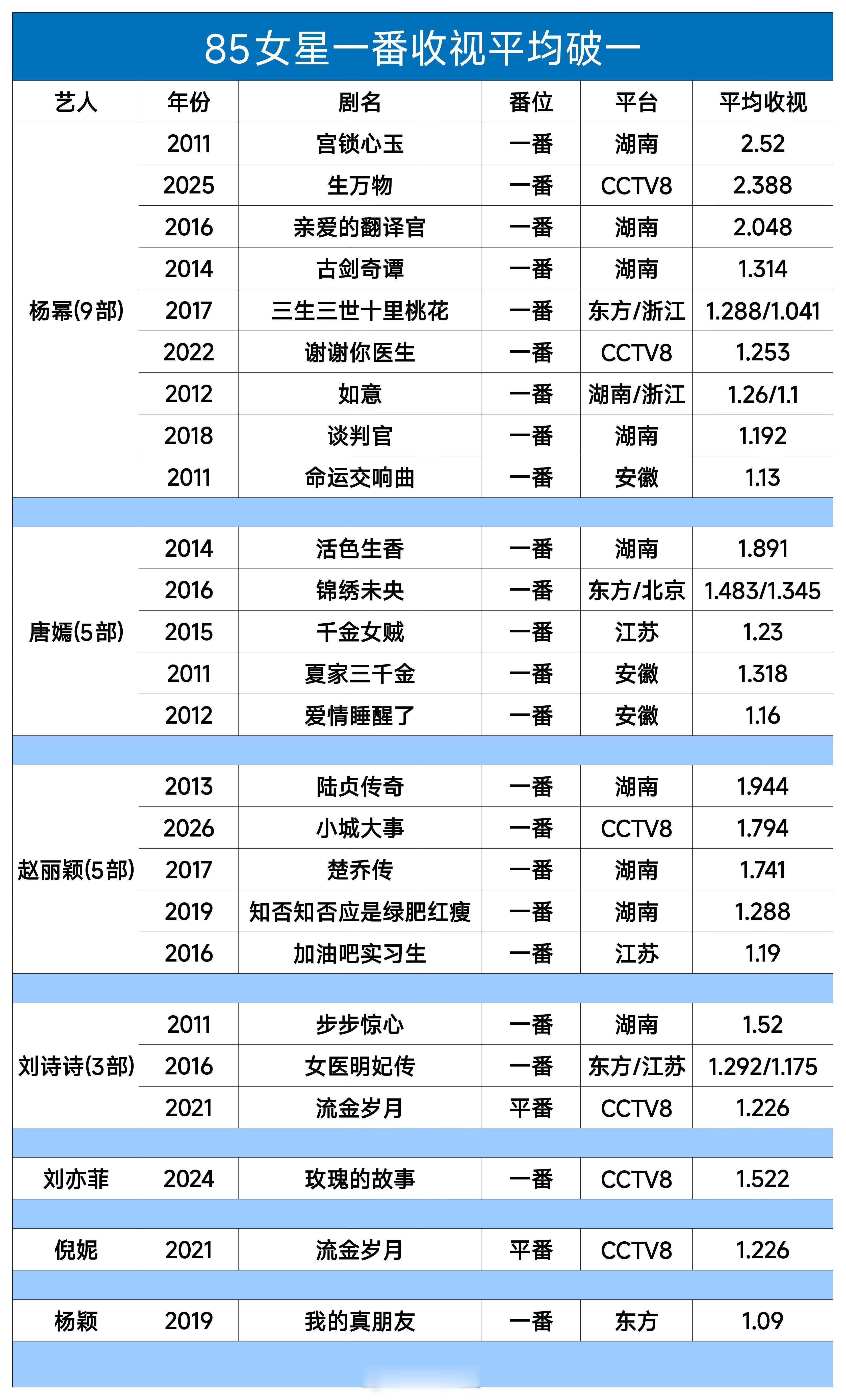 85花一番收视平均破一杨幂9部平均破一,依然是85花唯一一位一番平均破2女星,还是3部,厉害了!