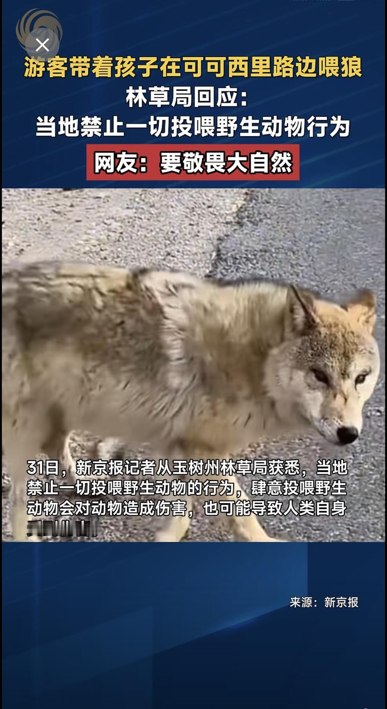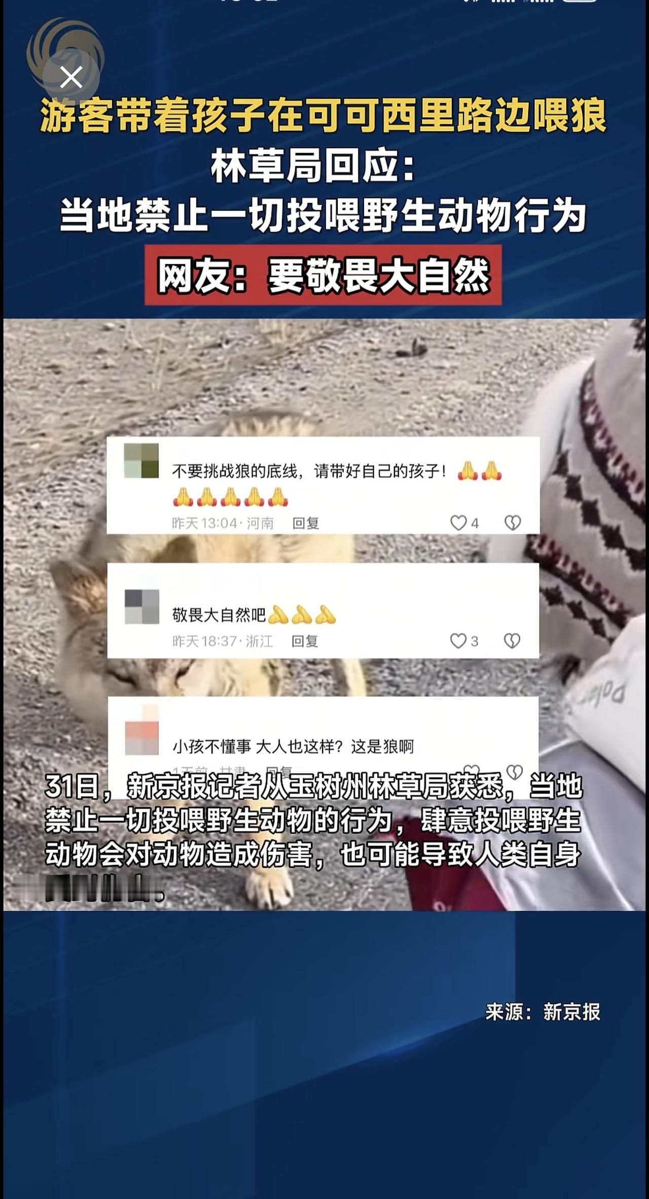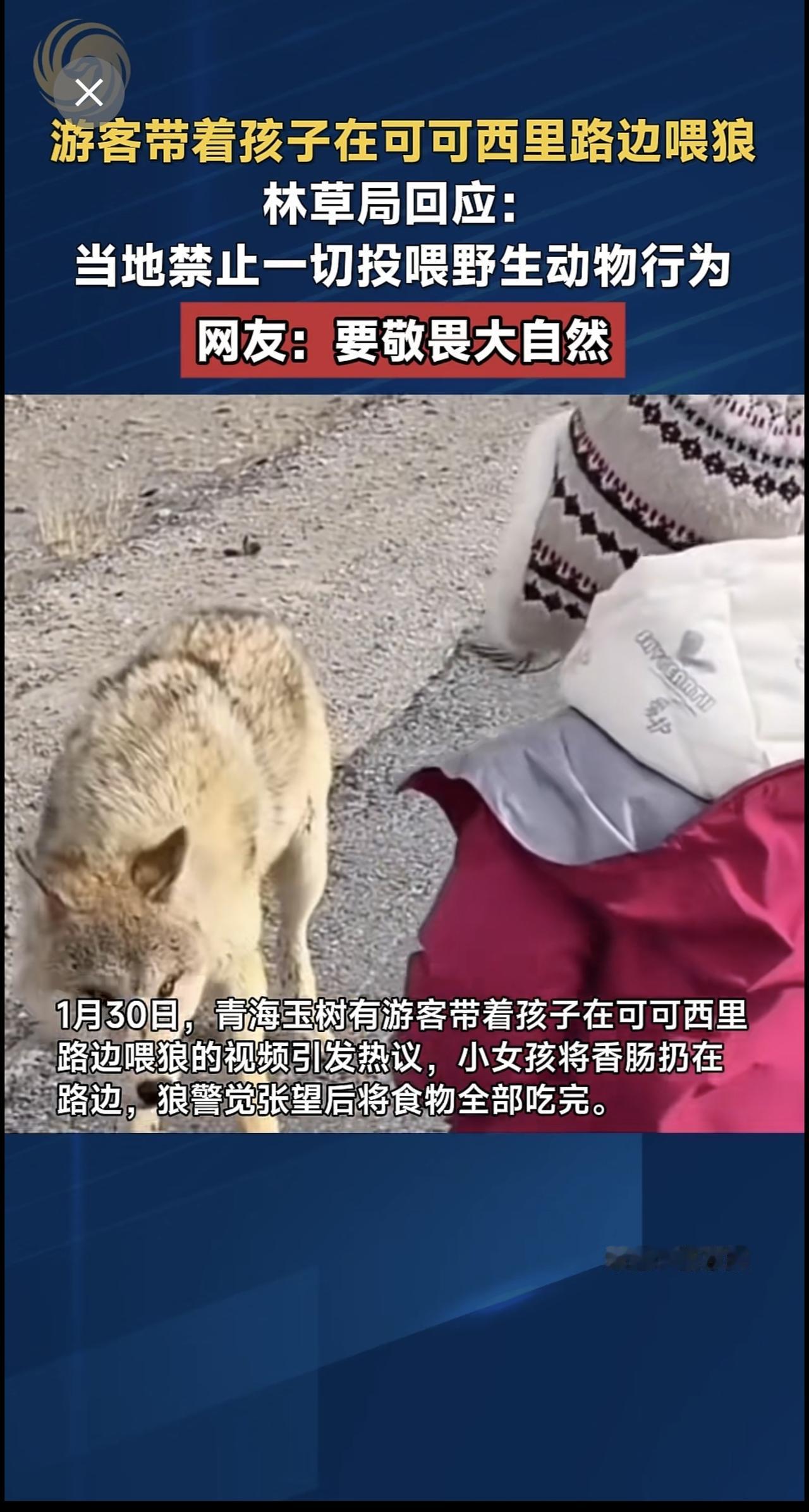 游客带着孩子在可可西里路边喂狼,林草局回应:当地禁止一切投喂野生动物行为,网友:要敬畏大自然。
