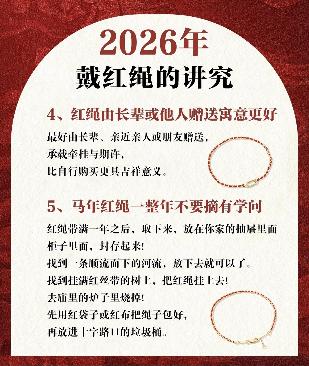 2026年是丙午马年,民间素有戴红绳迎新春的传统习俗,俗称“扎红”“踩红”。红色在传统文化中象征阳气充盈、喜庆吉祥,承载着人们辞旧迎新、辟邪纳福的美好期许,这份习俗并非迷信,而是刻在骨子里的文化认同与心理慰藉。红绳佩戴不分男女老少,其中属马、鼠、牛、兔、狗五个生肖,因流年气场关联,佩戴红绳更能契合民俗寓意,助力全年顺遂。 马年戴红绳,左右手佩戴有明确民俗讲究,核心遵循“左进右出”的传统理念:属马、鼠、牛、兔者,年前佩戴左手吸纳福气,大年初一换戴右手规避烦忧;属猪、虎、猴者,年前戴右手挡去不顺,大年初一换戴左手承接好运;属羊、龙、蛇、鸡、狗者,则全年佩戴左手,寓意持续吸纳吉祥气场。佩戴时机优选元旦、除夕、春节及每月初一,这些节点年味浓厚、气场契合,能更好承接民俗祝福。 从民俗寓意来看,红绳以长辈或亲近之人赠送为佳。家人、挚友亲手赠予的红绳,承载着牵挂与期许,比自行购买更具温度与吉祥意义,这份心意加持让民俗祝福更显厚重。红绳佩戴后,建议一整年尽量不随意摘取,保持气场连贯,更好延续民俗寓意中的护佑之意。 红绳戴满一整年後,需妥善处理,不可随意丢弃,这是对民俗传统的恭敬。常见的合规处理方式有四种:一是封存于家中抽屉、柜子,留存全年美好回忆;二是系在挂满红丝带的许愿树上,延续美好祈愿;三是前往正规寺庙,在指定香炉中合规焚化;四是用红袋或红布包裹后,投入十字路口垃圾桶,圆满收尾这份民俗祝福。