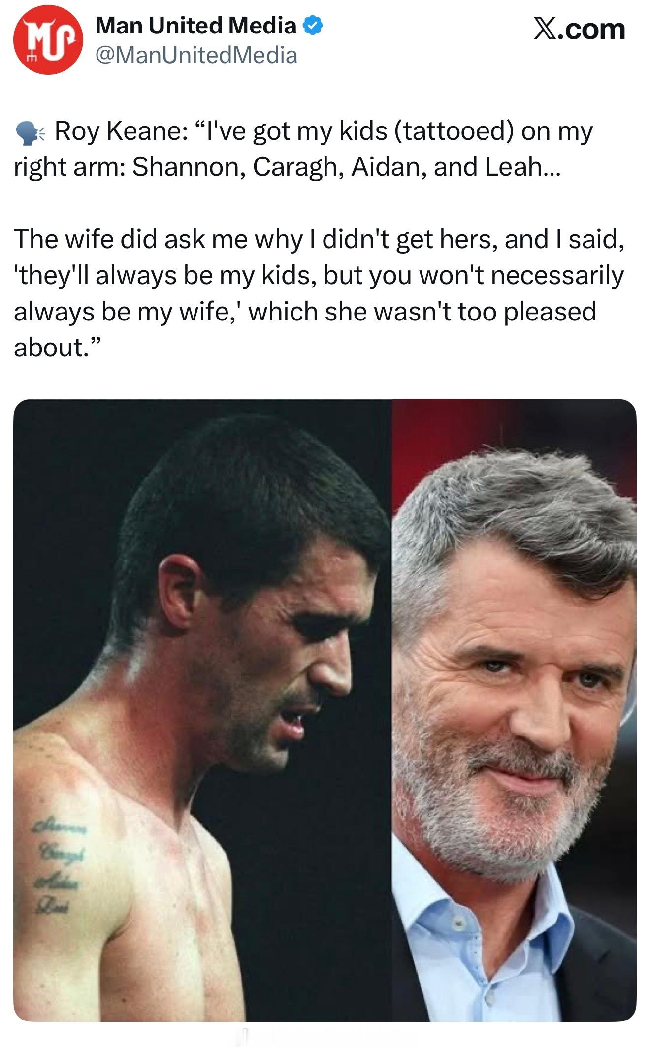 基恩:我曾经把孩子们的名字纹在胳膊上,但没有纹妻子的名字。妻子问为什么没有她的名字,我说,‘孩子将永远说我的孩子,你未来不需要一直是我的妻子。’她并不喜欢我的说辞。