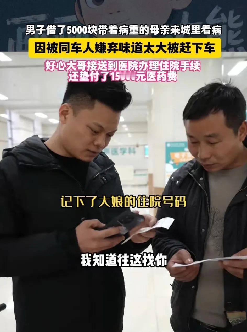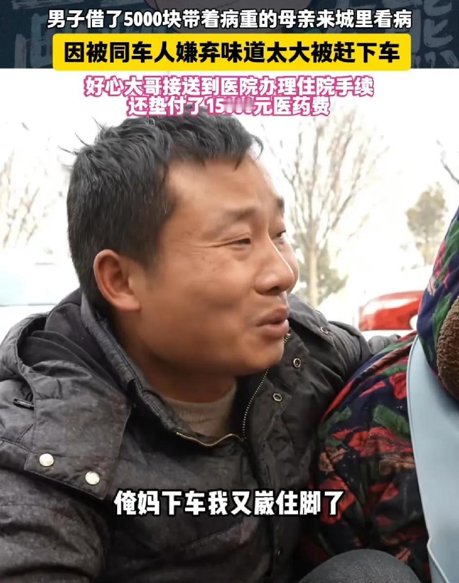 心酸泪目,底层人的苦。男子借了5000块钱,带着病重的母亲到城里看病。同车的人嫌弃味道太大,把娘俩赶下车了。他背着母亲在背上,一只手提着大包小包,步履艰难的在路边。路过的有一个好心的帅哥看到了这一幕,把娘俩送到了医院,还垫付了15000的医药费。真的是遇到好人了呀。 有人说穷是穷,但为什么不讲卫生?挣扎在贫困线上的人他想着每天怎样劳作能吃饱饭,卫生上也许会忽略一点。老人病重了身上有点异味也是可以理解的。到什么时候老百姓都过上了安安稳稳的好日子,吃喝不愁,看病不愁,就好了。