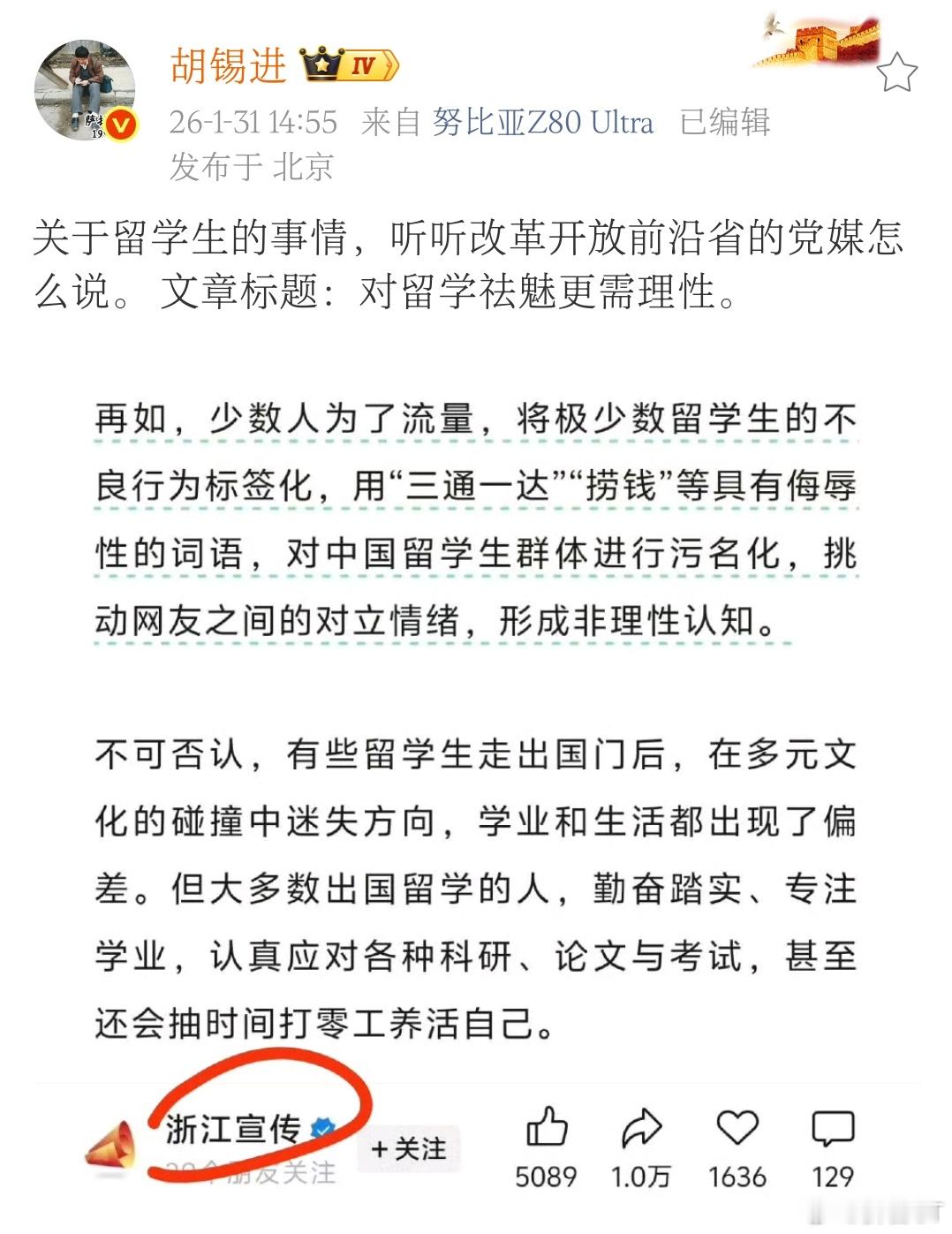 今天下午,老胡突然转发浙江宣传文章,号召大家听听浙江省官媒怎么说。