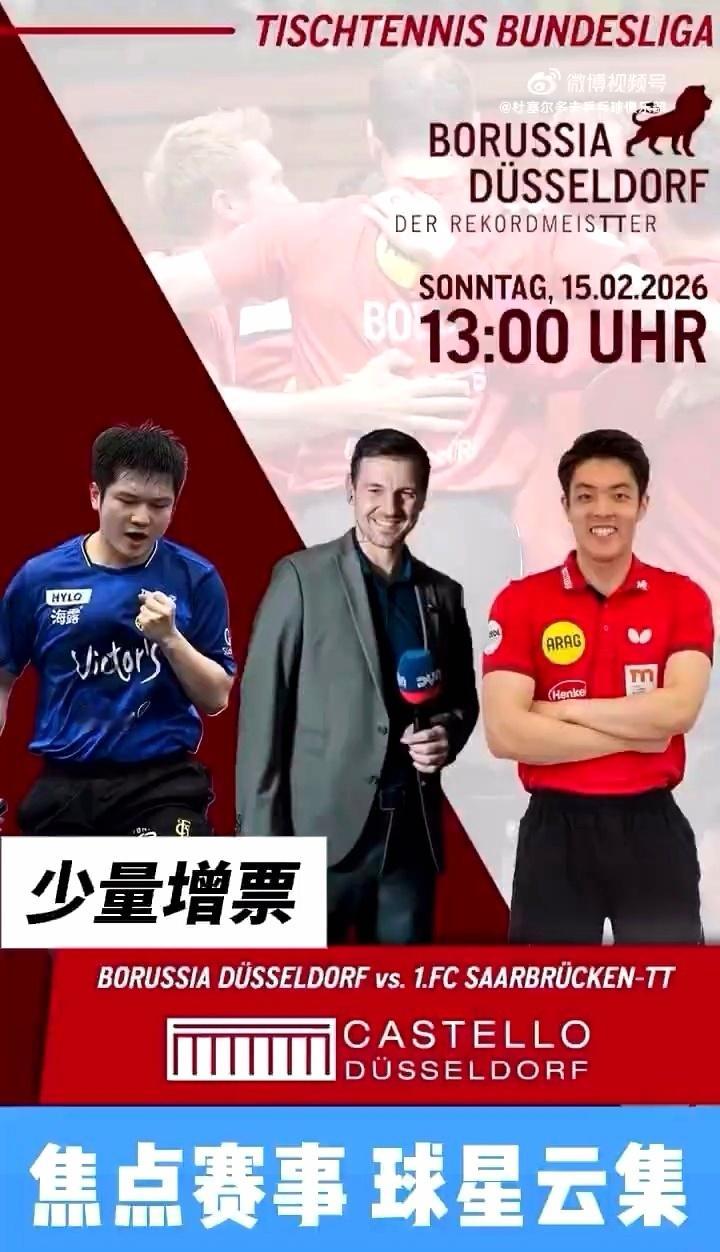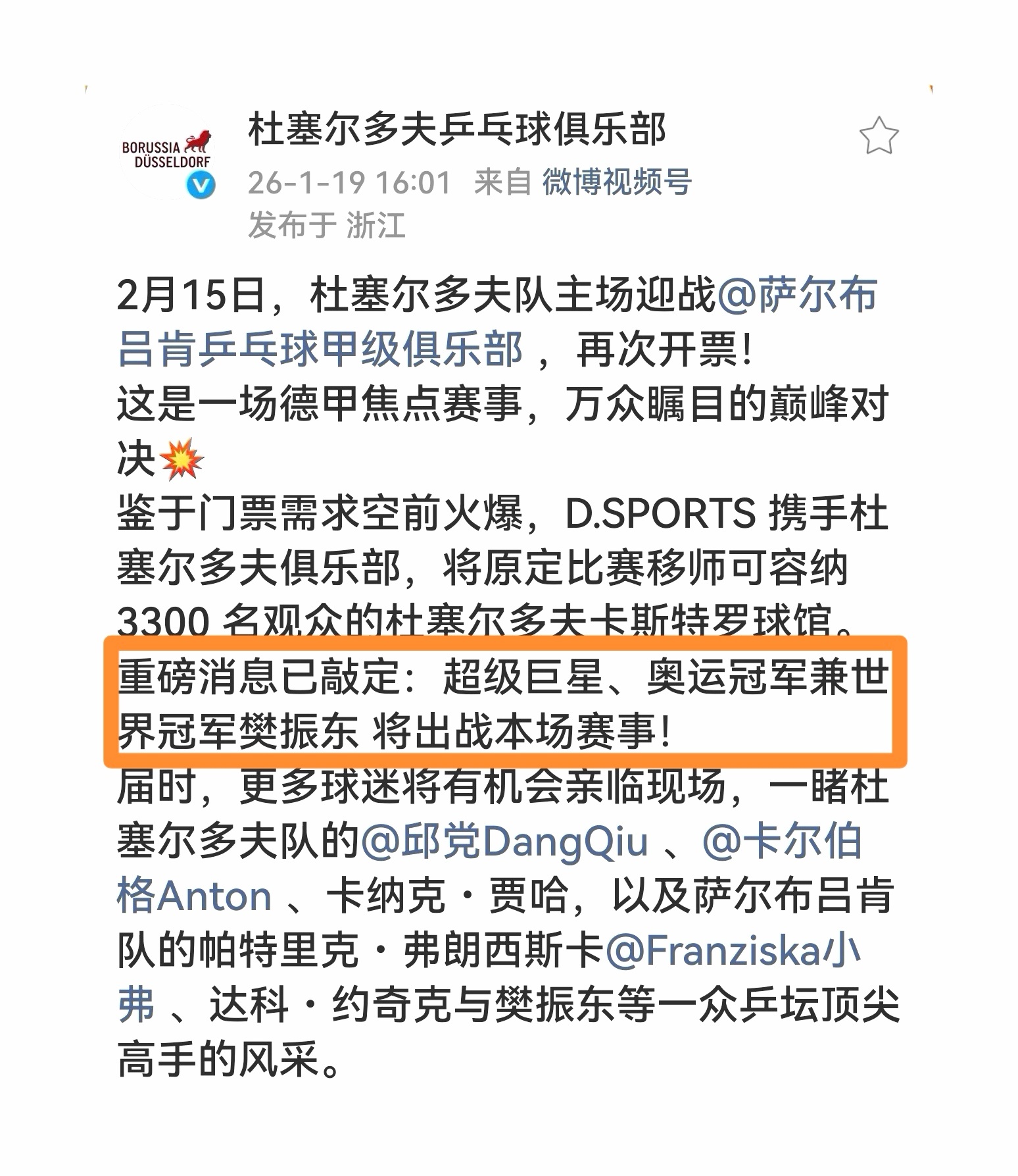除夕前两天,东哥球迷喜提“双重盛宴”!欧冠+德甲背靠背开战:2月14日欧冠主场迎战亨尼邦,次日德甲客场对阵杜塞尔多夫。因为想见东哥的人太多,杜塞直接将主场迁至3300座的卡斯特罗球馆。更贴心的是,比赛特意为中国球迷提前至晚8点——不熬大夜舒服看球。这排面,只属东哥!樊振东效力俱乐部出大事了樊振东用乒乓球拥抱全世界樊振东让这波乒足联动燃起来了