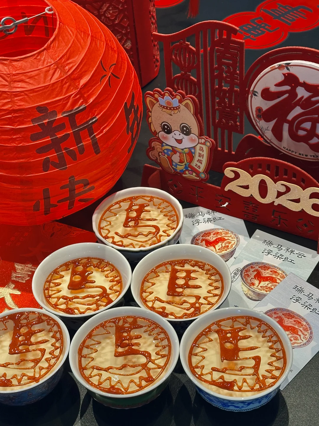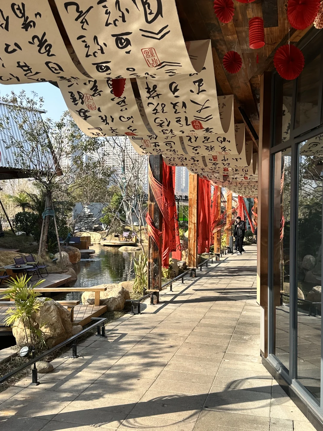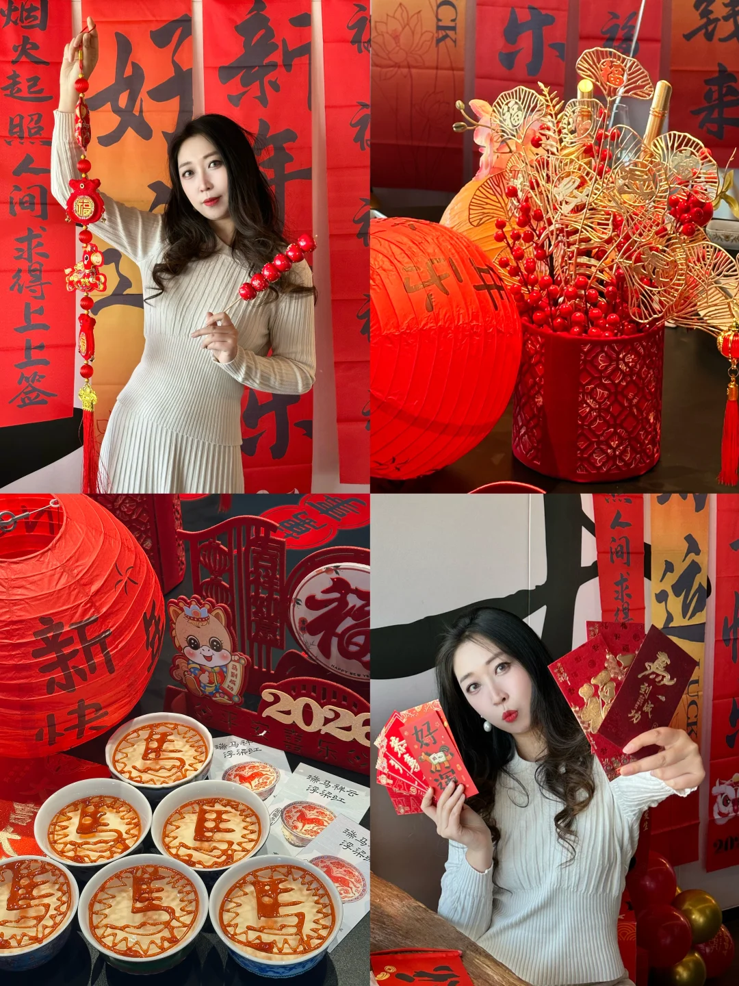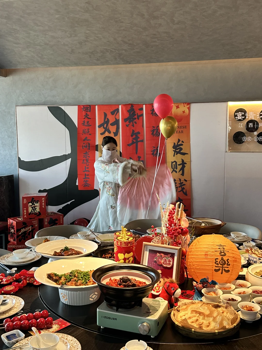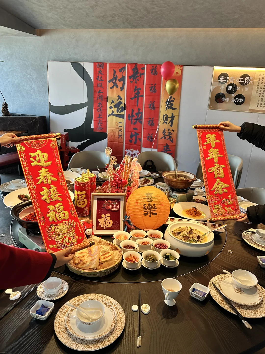 包厢里挂着红灯笼、新年挂布