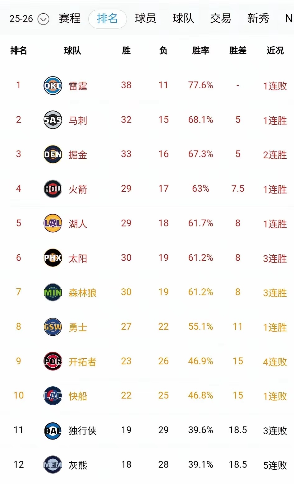 西部排名继续混乱,一场比赛改变几支球队排名……湖人太阳双双赢球,森林狼被挤到附加赛区了。快船开拓者双双输球,不影响各自排名,依然稳居附加赛区。勇士对于输赢没多大欲望,牢牢占据西部第八,上不能下不能。掘金击败快船,胜场差追平马刺。nba