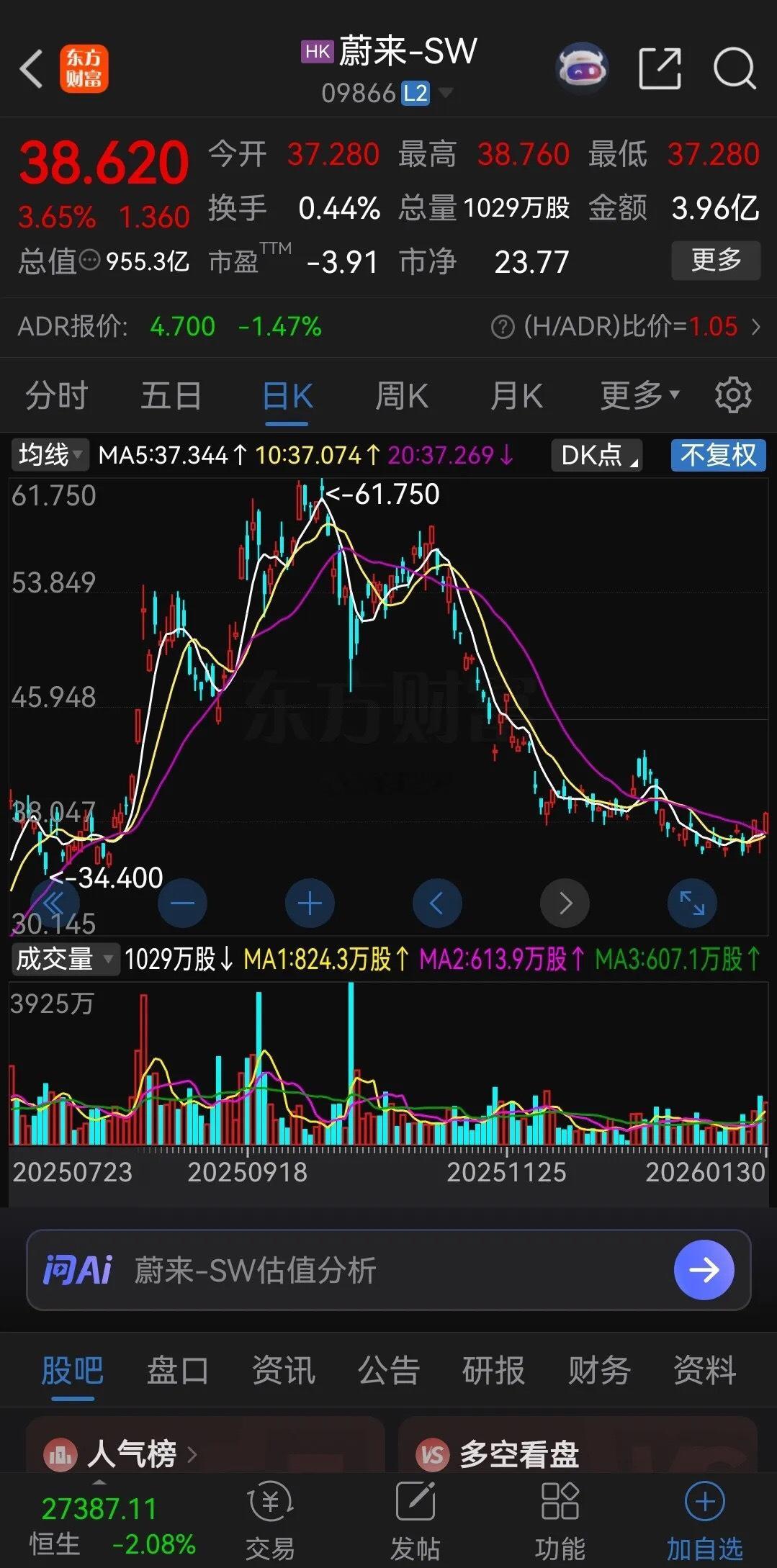 蔚来从去年一月份的最高61.75港元跌到了最低35.64港元,下跌42%。