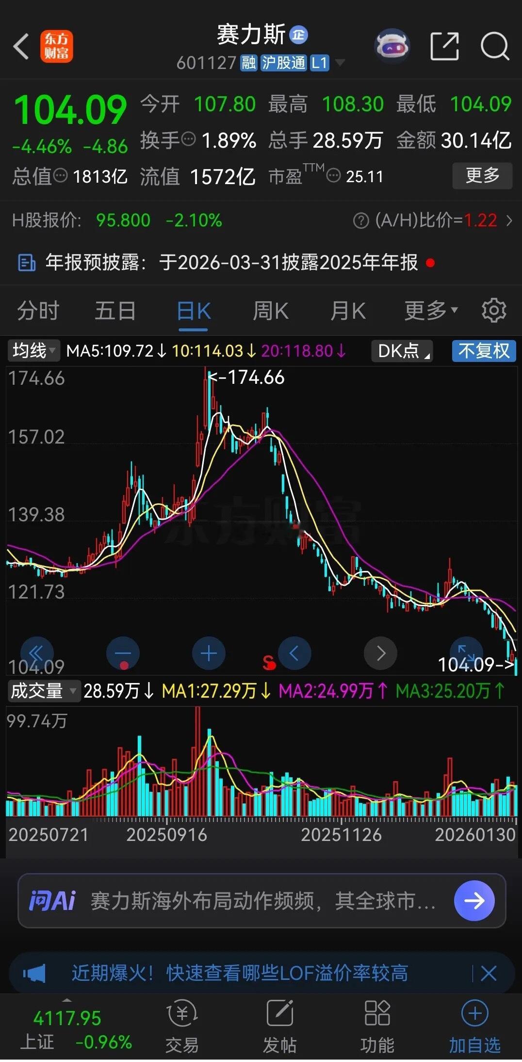 赛力斯从去年9月底的最高174.66元跌到了最低104.09元,下跌40%。