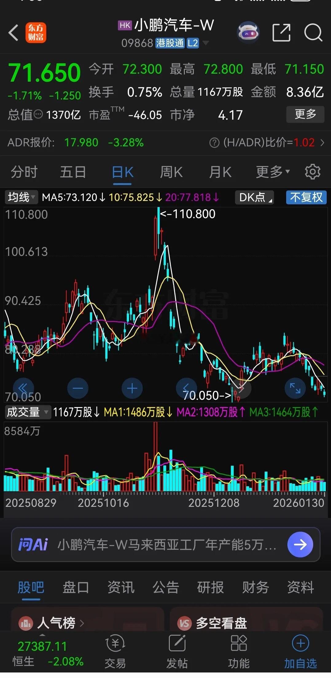 小鹏汽车从去年11月份的最高110.8港元跌到了最低70港元,下跌37%。