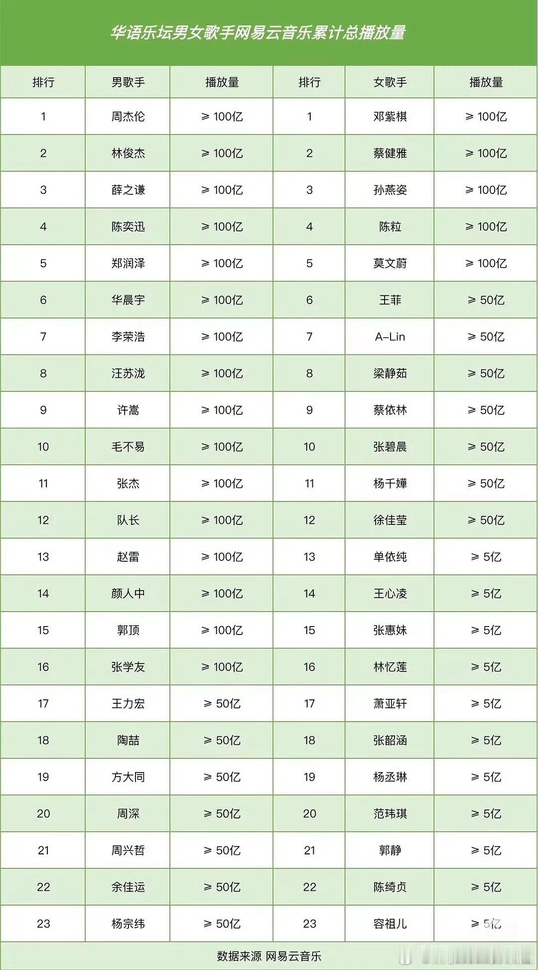 网易云音乐华语歌手播放量统计,破百亿的华语歌手周杰伦、林俊杰、薛之谦、陈奕迅均在列,没有新晋华语乐坛顶流梓渝