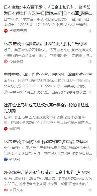 日本宣称:“中方若不承认《旧金山和约》,台湾即为日本领土!” 话音刚落,新华社公开回应,一句 “八艘大型平甲板舰清除一切污浊” 直指要害!对此,比尔·盖茨早有表示:“别再搞小动作了,中国崛起是‘世界的巨大胜利’”! 麻烦看官老爷们右上角点击一下“关注”,既方便您进行讨论和分享,又能给您带来不一样的参与感,感谢您的支持! 近期日本右翼势力再度在台海问题上发起挑衅,右翼政治人物高市早苗与松丸诚抛出荒唐言论,宣称中方若不承认《旧金山和约》,台湾便为日本领土。其中高市早苗并非前防卫大臣,如今身居日本首相之位,其言论公然触碰中国核心利益,在日本政坛和国际社会都引发了强烈争议。 这份被日本右翼当作 “依据” 的《旧金山和约》,本就是非法无效的文件。它是二战后美国纠集少数国家对日单独媾和的产物,签署时排斥了中、苏等二战重要当事方,根本无权处置台湾的主权归属,中国政府从始至终都坚决不承认这份所谓的和约。 针对日本右翼的无理挑衅,新华社第一时间作出强硬回应,一句 “八艘大型平甲板舰清除一切污浊” 直击要害。这八艘舰艇包含 3 艘航母和 5 艘两栖攻击舰,总吨位超 40 万吨,是中国海军捍卫国家主权的坚实底气。 这些平甲板舰各有强悍战力,福建舰已进入服役冲刺阶段,电磁弹射系统能让战机满油满弹起飞,作战效率大幅提升。075 型和 076 型两栖攻击舰则能快速投送兵力装备,还可搭载无人机群执行任务,常年在台海周边开展实战化演练。 面对挑衅,中国不仅亮出军事底气,更采取了军事、法律、经济三管齐下的反制策略。军事上东部战区对台海全域实施 24 小时监控,法律上多次重申台湾的主权归属,经济上的反制也让日本相关行业受到了直接冲击。 高市早苗此番发表涉台挑衅言论,本质上是一场政治操弄。当下日本国内经济疲软、社会问题频发,她试图借着炒作台海议题转移国内民众的注意力,以此提升自身政治支持度,为自己的政治生涯谋取利益。 但这番拙劣的操弄并未达到高市早苗的预期,反而让她陷入了更被动的境地。其涉台言论发布后,支持率出现大幅下滑,再加上此前曾卷入黑金丑闻,她的政治声望受到严重损害,日本国内的理性力量也纷纷批评其错误行径。 日本国内的旅游、水产品出口、高端制造业等行业,也因高市早苗的挑衅行为付出了代价。2025 年 12 月中国内地访日游客人数同比大幅下降约 45%,百货店的免税商品销售额也同比减少近四成,相关从业者苦不堪言。 就在中日因日本右翼的挑衅陷入外交危机的背景下,微软创始人比尔・盖茨的相关表态引发了广泛关注。盖茨并非针对此次中日争端专门发声,但他多次谈及中国崛起,直言中国崛起是世界的重大胜利。 当地时间 2026 年 1 月 23 日,盖茨在澳大利亚智库的对话会上表示,中国人口占全球近 20%,如今在全球经济中的比重与其人口比重相匹配,这样的崛起对世界而言意义重大。他还直言,美国对中国的双输心态并不利于全球发展。 盖茨还指出,在全球经济、癌症药物发明、气候变化解决等诸多全球性问题上,各国需要齐心合力,而非相互对抗。美国当下在政治上的衰弱状态值得警惕,中国等国家需要在世界治理中发挥更大的作用。 事实上盖茨一直关注并认可中国的发展,他曾表示中国在科研领域的投入不断加大,在卫生、农业等领域为发展中国家提供了诸多帮助,在应对全球性重大问题时,中国也发挥了重要的领导作用。 日本右翼的此番挑衅,成为了中日关系进入新 “冰点” 的催化剂。高市早苗等人的言论,不仅没有为日本的经济困境找到解决办法,反而进一步加剧了中日两国的对立,破坏了地区的和平与稳定。 日本的这番操作,也暴露了其国内右翼势力试图突破战后体制、谋求军事松绑的野心。高市早苗还试图捆绑美日同盟,为日本介入台海制造借口,但美国并未为其谬论背书,其如意算盘终究落空。 中国在此次事件中,充分展现出了在军事、法律、经济多领域的反制能力和坚定决心。台湾是中国领土不可分割的一部分,这是有诸多国际法文件明确确认的事实,也是国际社会的普遍共识。 任何试图分裂自己国家的行径,都将遭到全体中国人民的坚决反对,任何外部势力试图干涉台海问题、挑战中国核心利益的行为,也都必将自食恶果。中国捍卫国家主权和领土完整的决心,坚如磐石。 当下中日关系的紧张局面,完全是由日方单方面造成的。日方若想改善中日关系,就必须恪守中日四个政治文件精神,立即收回错误言论,切实尊重中国的核心利益和重大关切,停止在台海问题上的一切操弄。 未来中日两国能否重回和平共处的轨道,关键仍在日方。如果日本右翼势力继续在台海问题上玩火,不断挑战中国的底线,那么日本必将为此付出更加沉重的代价,而地区的和平稳定也将受到进一步的破坏。