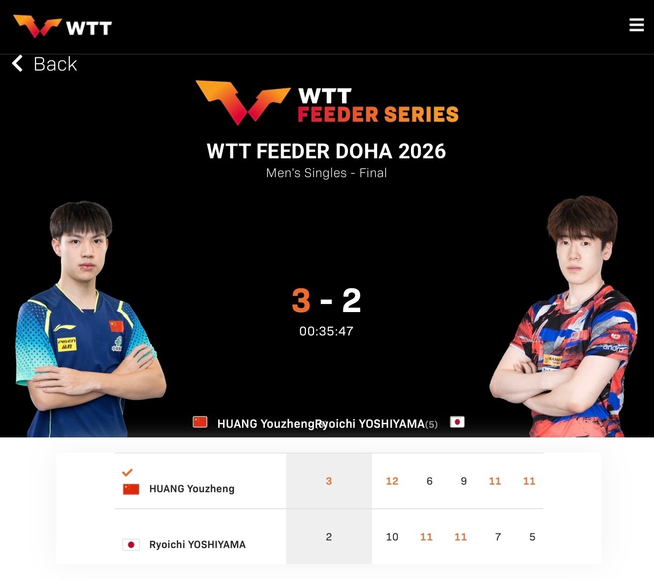 黄友政3比2吉山僚一夺得WTT支线赛多哈站男单冠军收获个人首个国际成人赛事单打冠