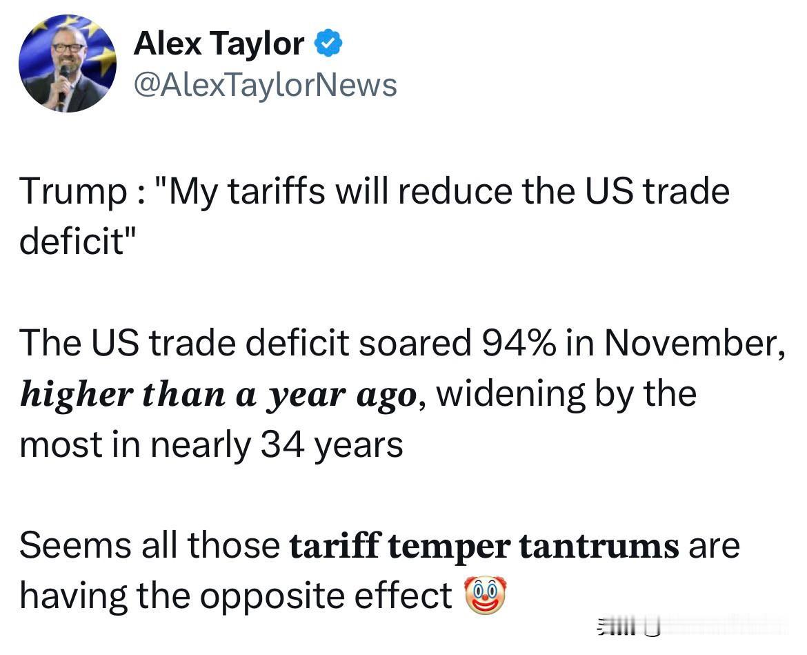 美国媒体报道:美国的进出口贸易逆差创新高,上升的趋势与总统的描述背道而驰。 特朗普一直在说说:“我的关税将减少美国的贸易逆差!” 但是,客观事实是美国贸易逆差在11月飙升了94%,高于一年前,是近34年来增长的最大值。 似乎所有这些贸易关税战,都产生了相反的效果。